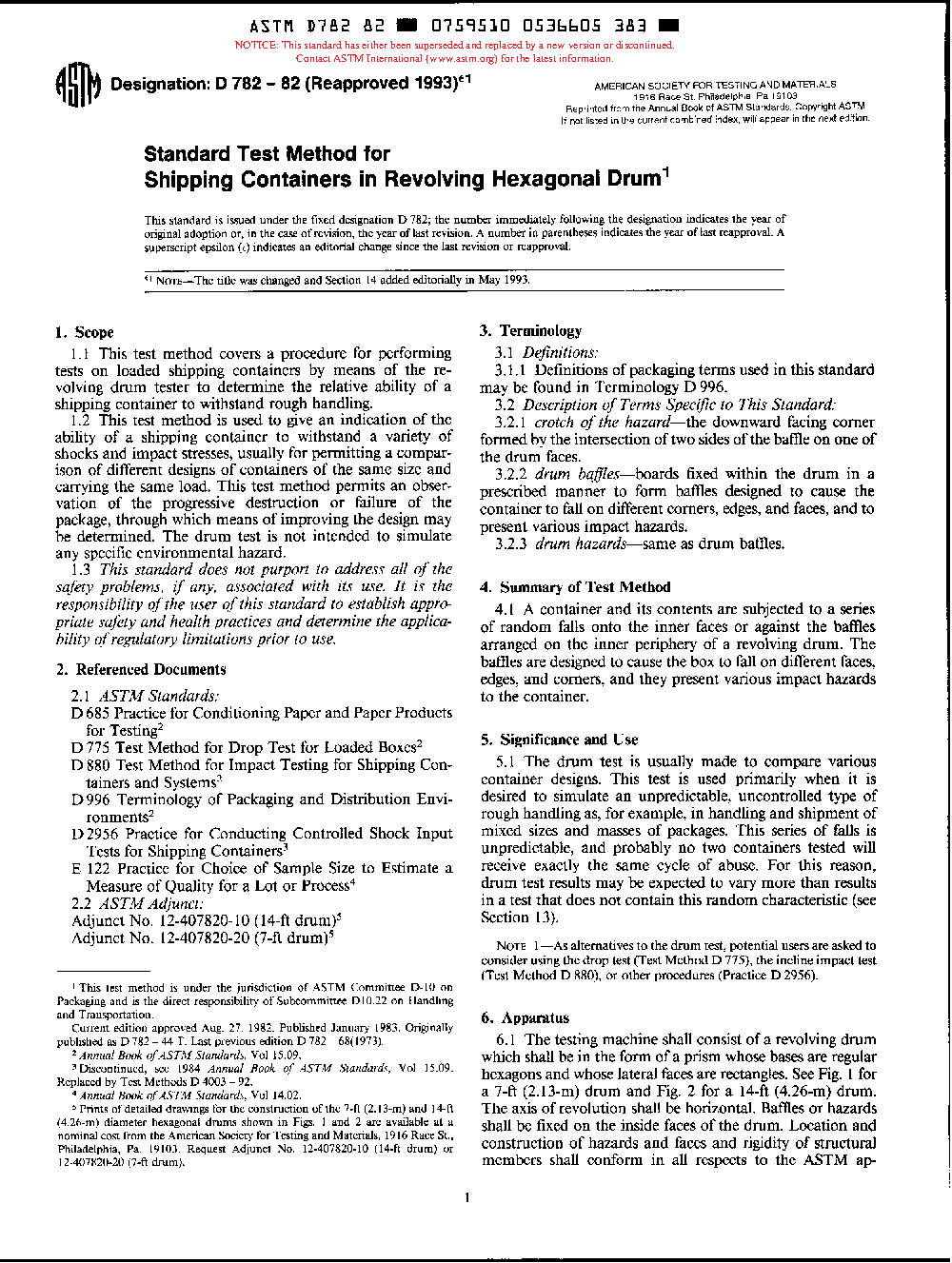 1.2 This test method is used to give an indication of the ability of a shipping container to withstand a variety of shocks and impact stresses, usually for permitting a comparison of different designs of containers of the same size and carrying the same load. This test method permits an observation of the progressive destruction or failure of the package, through which means of improving the design may be determined. The drum test is not intended to simulate any specific environmental hazard.