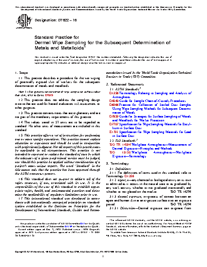 1.1 This practice describes a procedure for the wet wiping of potentially exposed skin of workers for the subsequent determination of metals and metalloids.