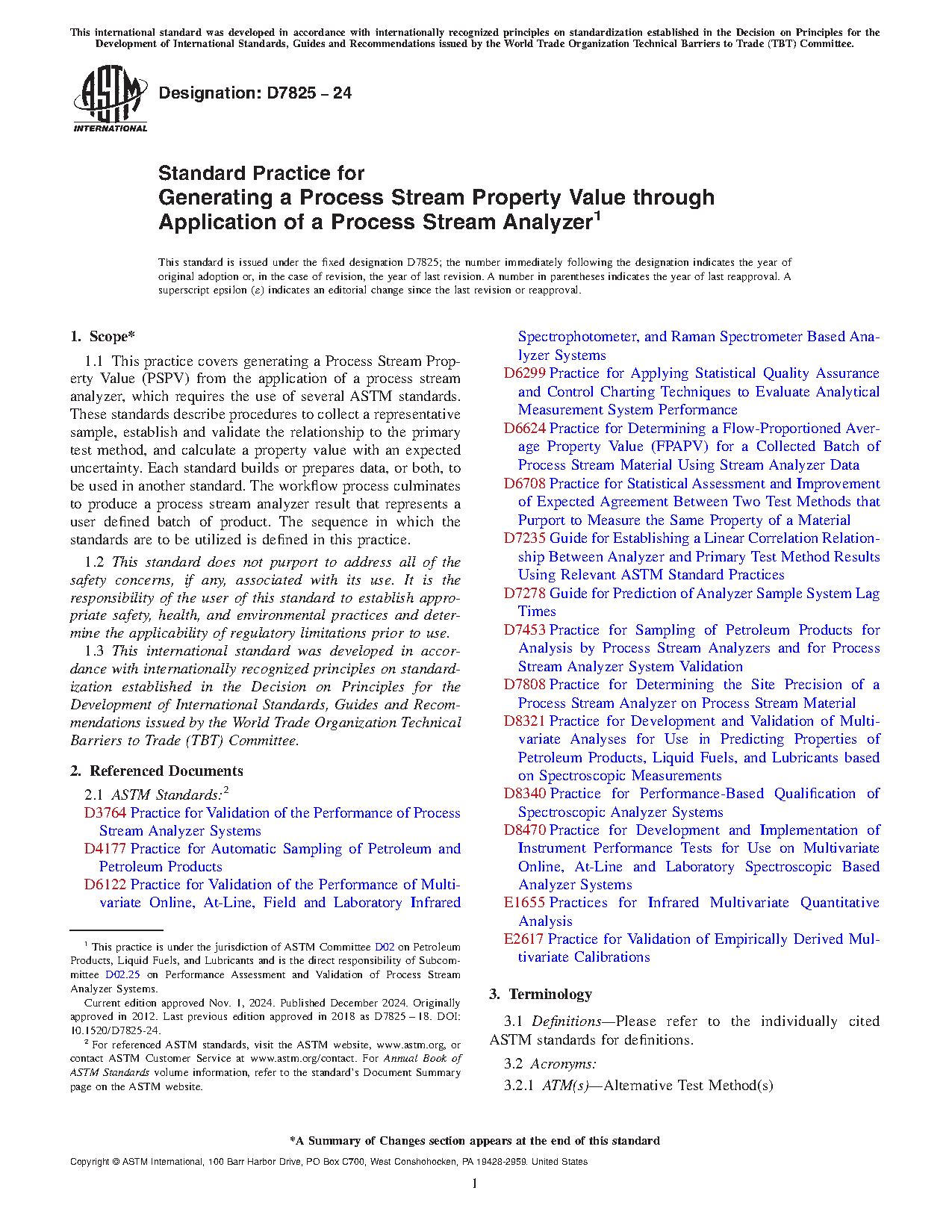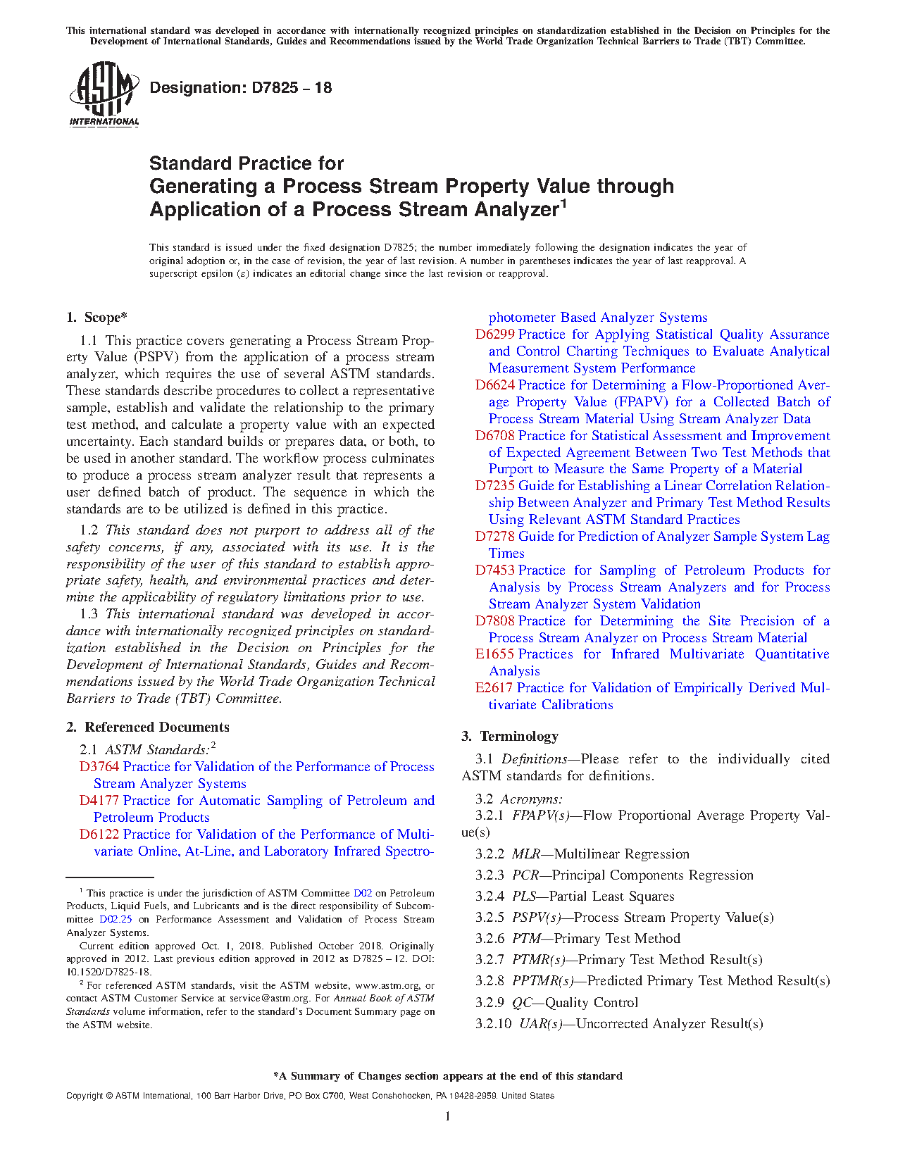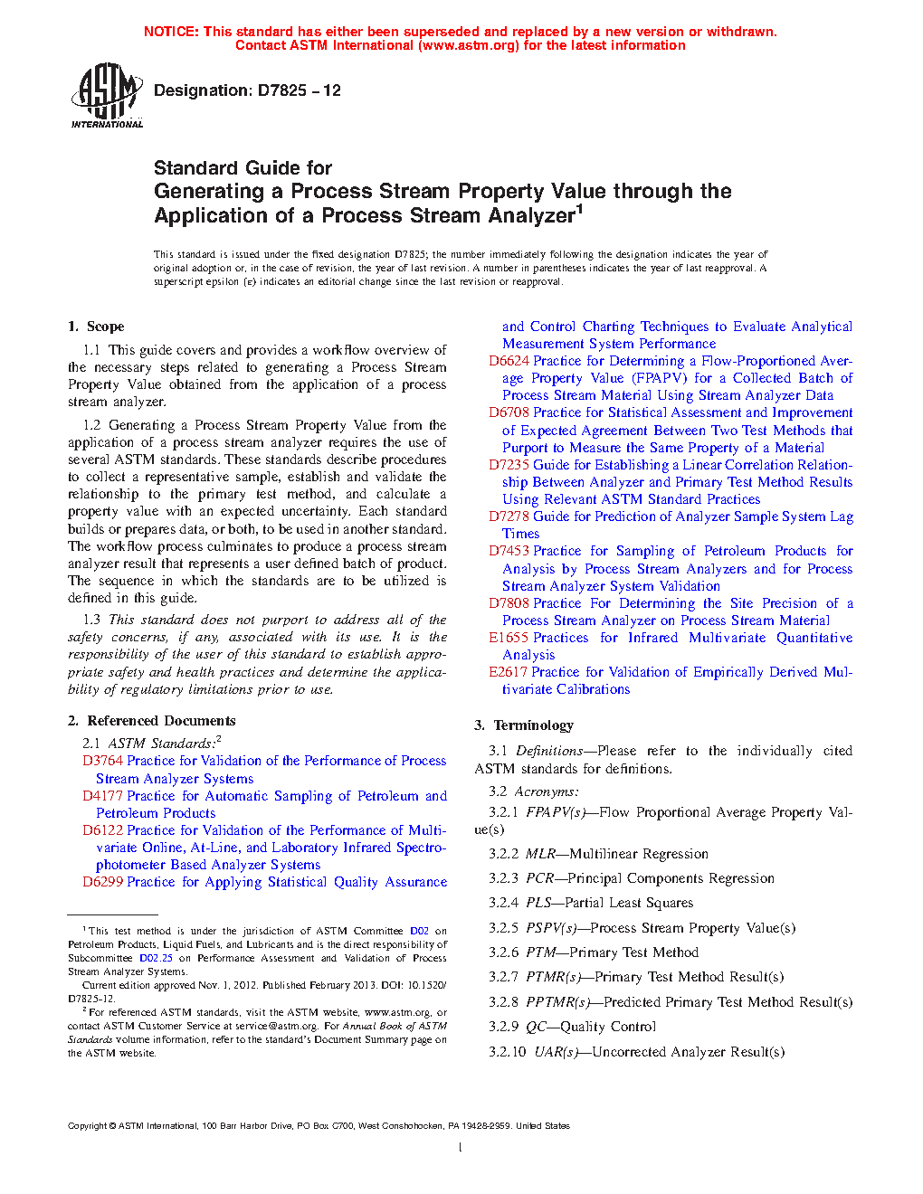 1.1 This practice covers generating a Process Stream Property Value (PSPV) from the application of a process stream analyzer, which requires the use of several ASTM standards. These standards describe procedures to collect a representative sample, establish and validate the relationship to the primary test method, and calculate a property value with an expected uncertainty. Each standard builds or prepares data, or both, to be used in another standard. The workflow process culminates to produce a process stream analyzer result that represents a user defined batch of product. The sequence in which the standards are to be utilized is defined in this practice.