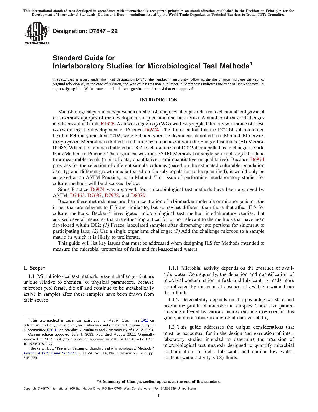 1.2 This guide addresses the unique considerations that must be accounted for in the design and execution of interlaboratory studies intended to determine the precision of microbiological test methods designed to quantify microbial contamination in fuels, lubricants and similar low water-content (water activity <0.8) fluids.