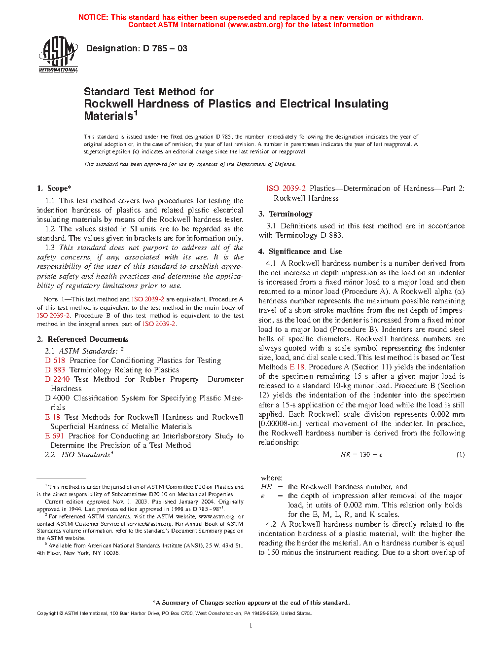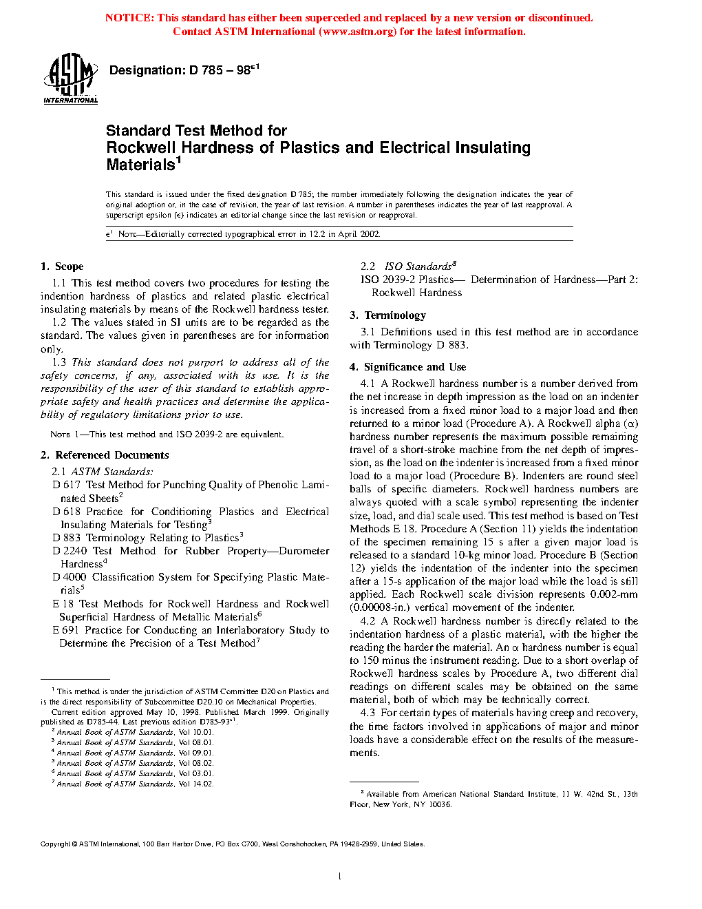 1.3 This standard does not purport to address all of the safety concerns, if any, associated with its use. It is the responsibility of the user of this standard to establish appropriate safety and health practices and determine the applicability of regulatory limitations prior to use. Note 1—This test method and ISO 2039-2 are equivalent. Procedure A of this test method is equivalent to the test method in the main body of ISO 2039-2. Procedure B of this test method is equivalent to the test method in the integral annex part of ISO 2039-2. A Rockwell hardness number is a number derived from the net increase in depth impression as the load on an indenter is increased from a fixed minor load to a major load and then returned to a minor load (Procedure A). A Rockwell alpha (α) hardness number represents the maximum possible remaining travel of a short-stroke machine from the net depth of impression, as the load on the indenter is increased from a fixed minor load to a major load (Procedure B). Indenters are round steel balls of specific diameters. Rockwell hardness numbers are always quoted with a scale symbol representing the indenter size, load, and dial scale used. This test method is based on Test Methods E 18 A Rockwell hardness number is directly related to the indentation hardness of a plastic material, with the higher the reading the harder the material. An α hardness number is equal to 150 minus the instrument reading. Due to a short overlap of Rockwell hardness scales by Procedure A, two different dial readings on different scales may be obtained on the same material, both of which may be technically correct. For certain types of materials having creep and recovery, the time factors involved in applications of major and minor loads have a considerable effect on the results of the measurements. The results obtained by this test method are not generally considered a measure of the abrasion or wear resistance of the plastic materials in question. Indentation hardness is used as an indication of cure of some thermosetting materials at room temperature. Generally, an uncured specimen has a hardness reading below normal. Each Rockwell hardness scale in Table 1 is an extension of the proceeding less severe scale, and while there is some overlap between adjacent scales, a correlation table is not desirable. Readings on one material may be satisfactory for such a table, but there is no guarantee that other plastic materials will give corresponding readings because of differences in elasticity, creep, and shear characteristics. Before proceeding with this test method, reference should be made to the specification of the material being tested. Any test specimen preparation, conditioning, dimensions, and/or testing parameters covered in the materials specification shall take precedence over those mentioned in this test method. If there are no material specifications, then the default conditions apply.