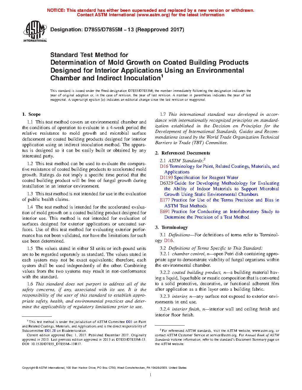 1.4 The test method is intended for the accelerated evaluation of mold growth on a coated building product designed for interior use. This method is not intended for evaluation of surfaces designed for exterior applications or uncoated surfaces. Use of this test method for evaluating exterior performance has not been validated, nor have the limitations for such use been determined.