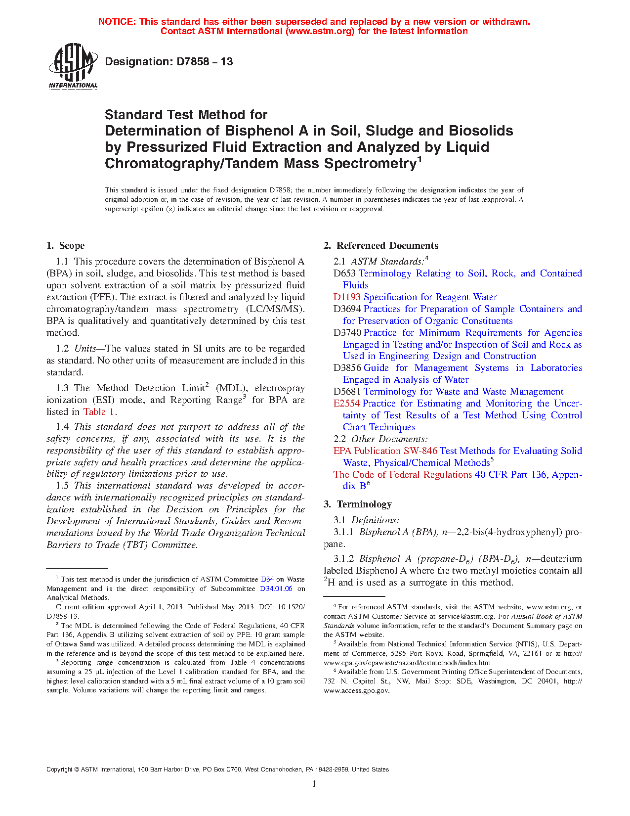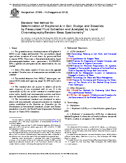 1.1 This procedure covers the determination of Bisphenol A (BPA) in soil, sludge, and biosolids. This test method is based upon solvent extraction of a soil matrix by pressurized fluid extraction (PFE). The extract is filtered and analyzed by liquid chromatography/tandem mass spectrometry (LC/MS/MS). BPA is qualitatively and quantitatively determined by this test method.