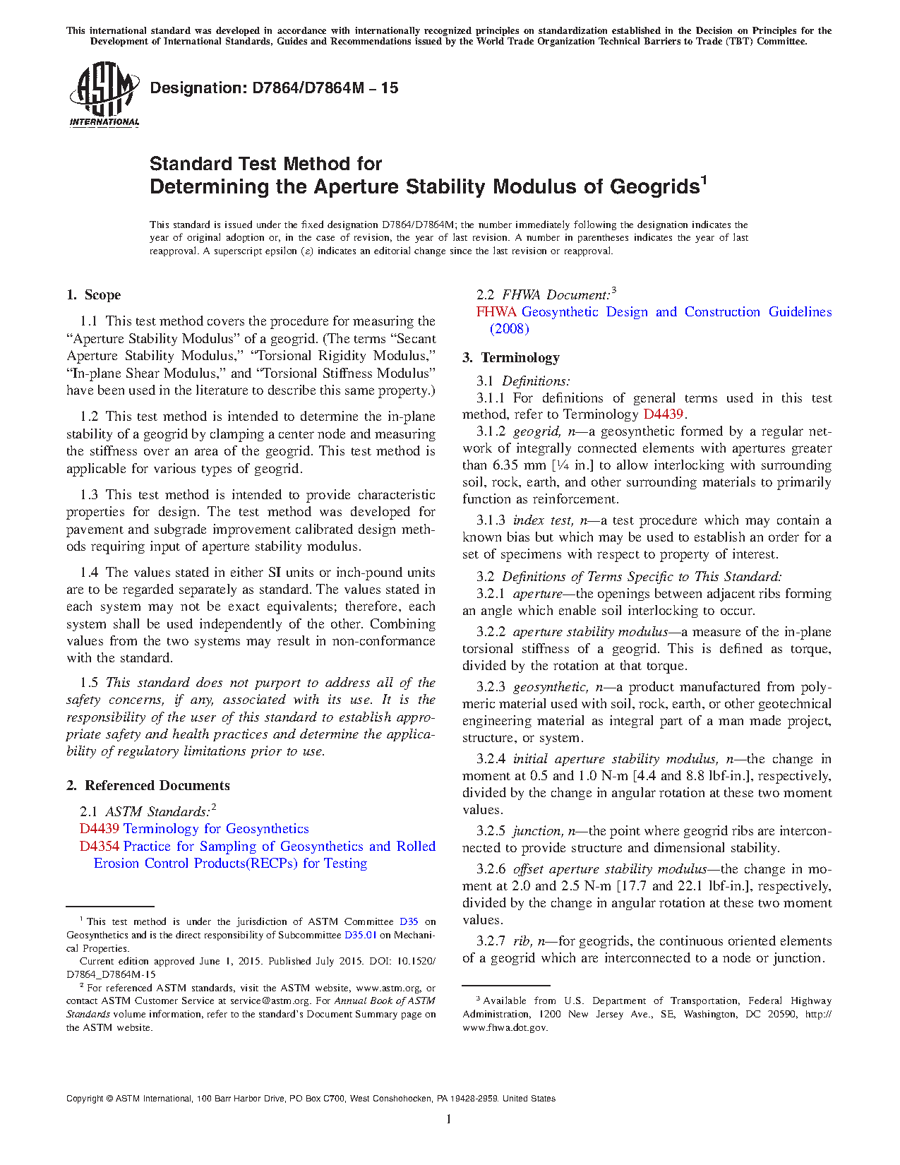 Note 1: Aperture stability modulus is referenced in the FHWA Geosynthetics Design and Construction Guidelines (2008) as an input parameter for the design of geogrid-reinforced unpaved roads using punched and drawn biaxial geogrids. Geogrids of different manufacturing process and material composition may use this property in calibration and validation of their material within the associated design.