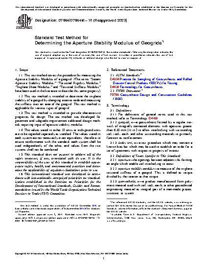 1.1 This test method covers the procedure for measuring the “Aperture Stability Modulus” of a geogrid. (The terms “Secant Aperture Stability Modulus,” “Torsional Rigidity Modulus,” “In-plane Shear Modulus,” and “Torsional Stiffness Modulus” have been used in the literature to describe this same property.)
