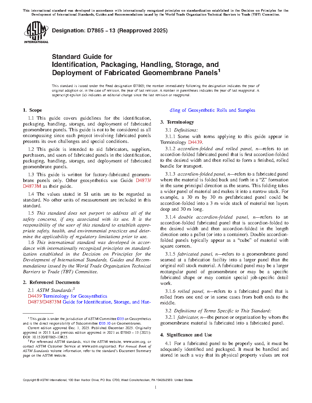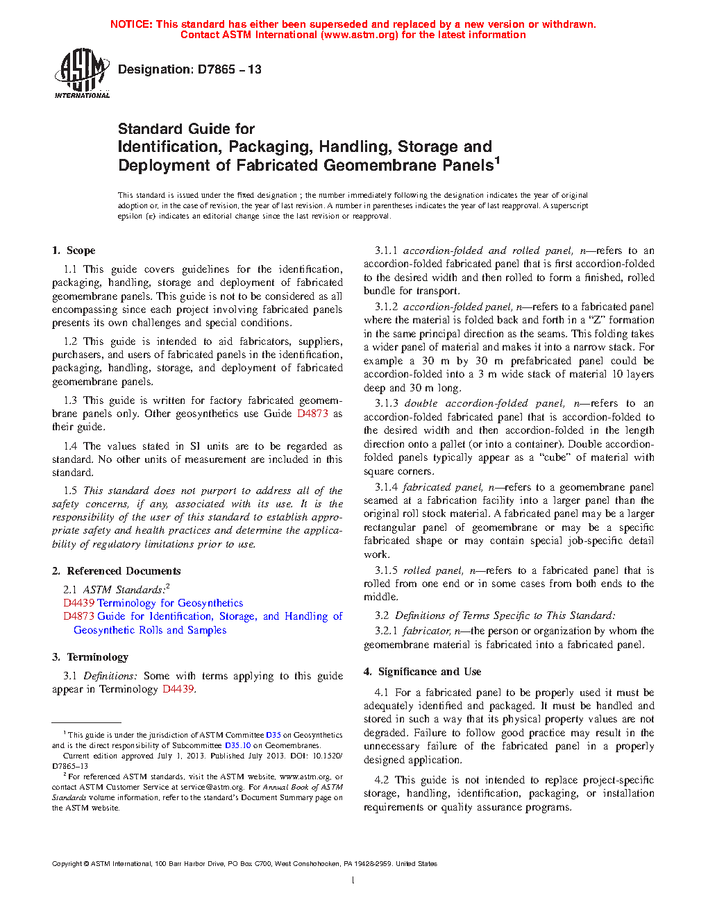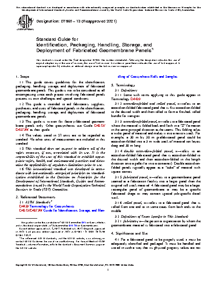 1.1 This guide covers guidelines for the identification, packaging, handling, storage, and deployment of fabricated geomembrane panels. This guide is not to be considered as all encompassing since each project involving fabricated panels presents its own challenges and special conditions.