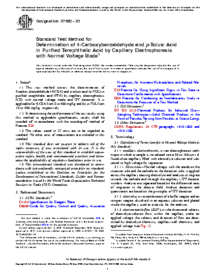 1.1 This test method covers the determination of 4-carboxybenzaldehyde (4-CBA) and p-toluic acid (p-TOL) in purified terephthalic acid (PTA) by capillary electrophoresis (CE) with normal voltage mode and UV detection. It is applicable for 4-CBA from 5 to 400 mg/kg and for p-TOL from 10 to 400 mg/kg, respectively.
