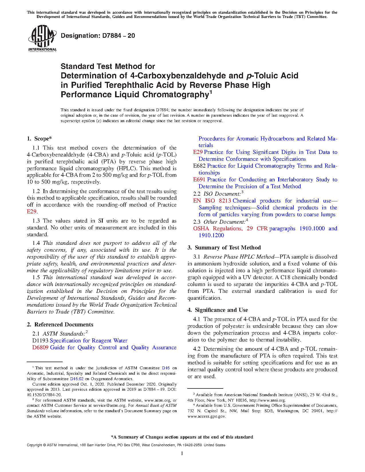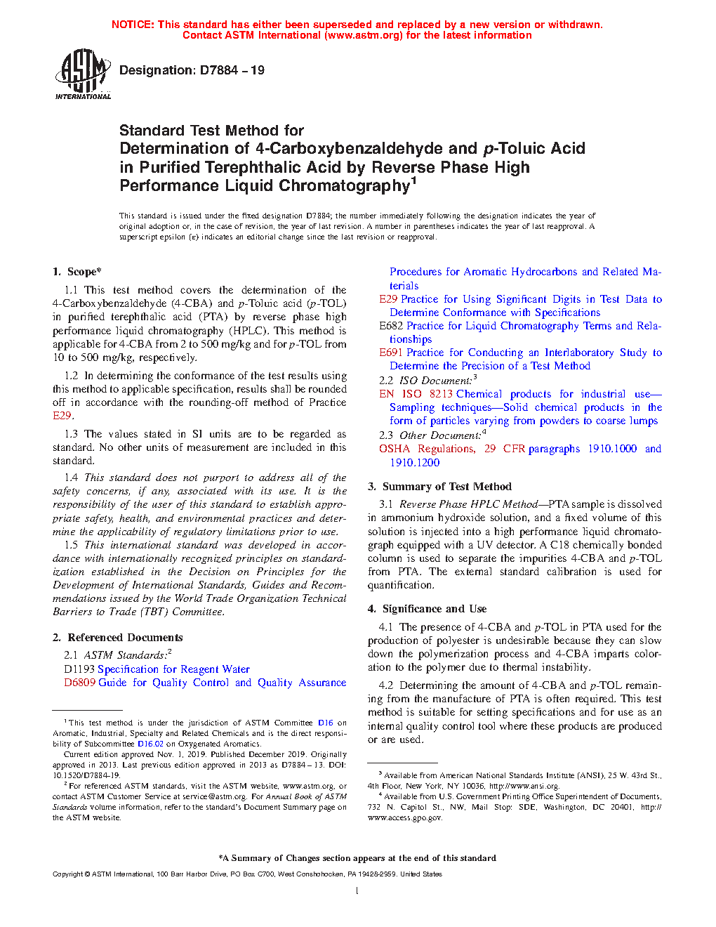 4.2 Determining the amount of 4-CBA and p-TOL remaining from the manufacture of PTA is often required. This test method is suitable for setting specifications and for use as an internal quality control tool where these products are produced or are used.