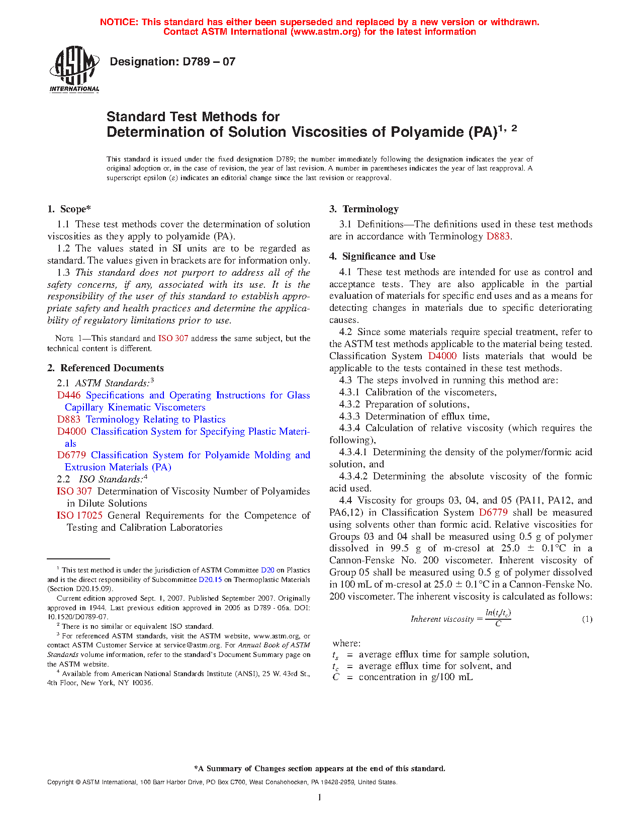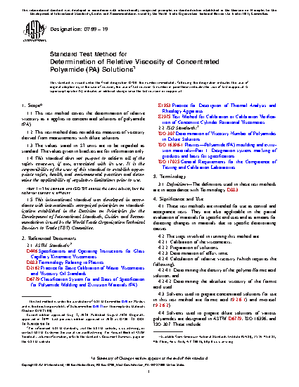 1.1 This test method covers the determination of relative viscosity as it applies to concentrated solutions of polyamide (PA).