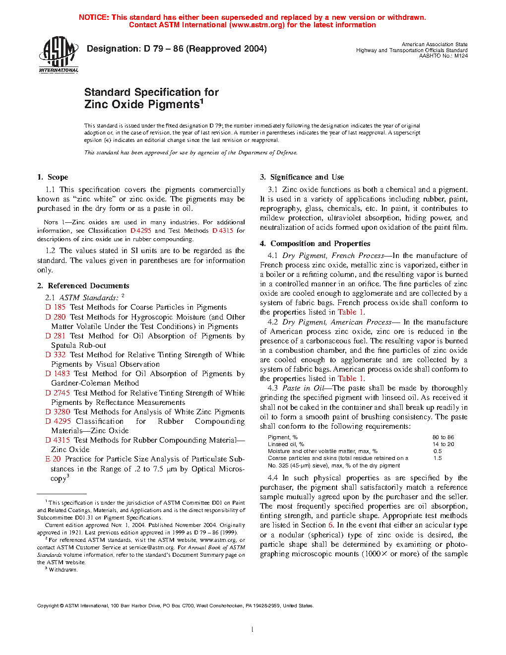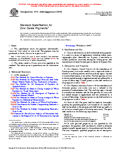 1.1 This specification covers the pigments commercially known as "zinc white" or zinc oxide. The pigments may be purchased in the dry form or as a paste in oil.