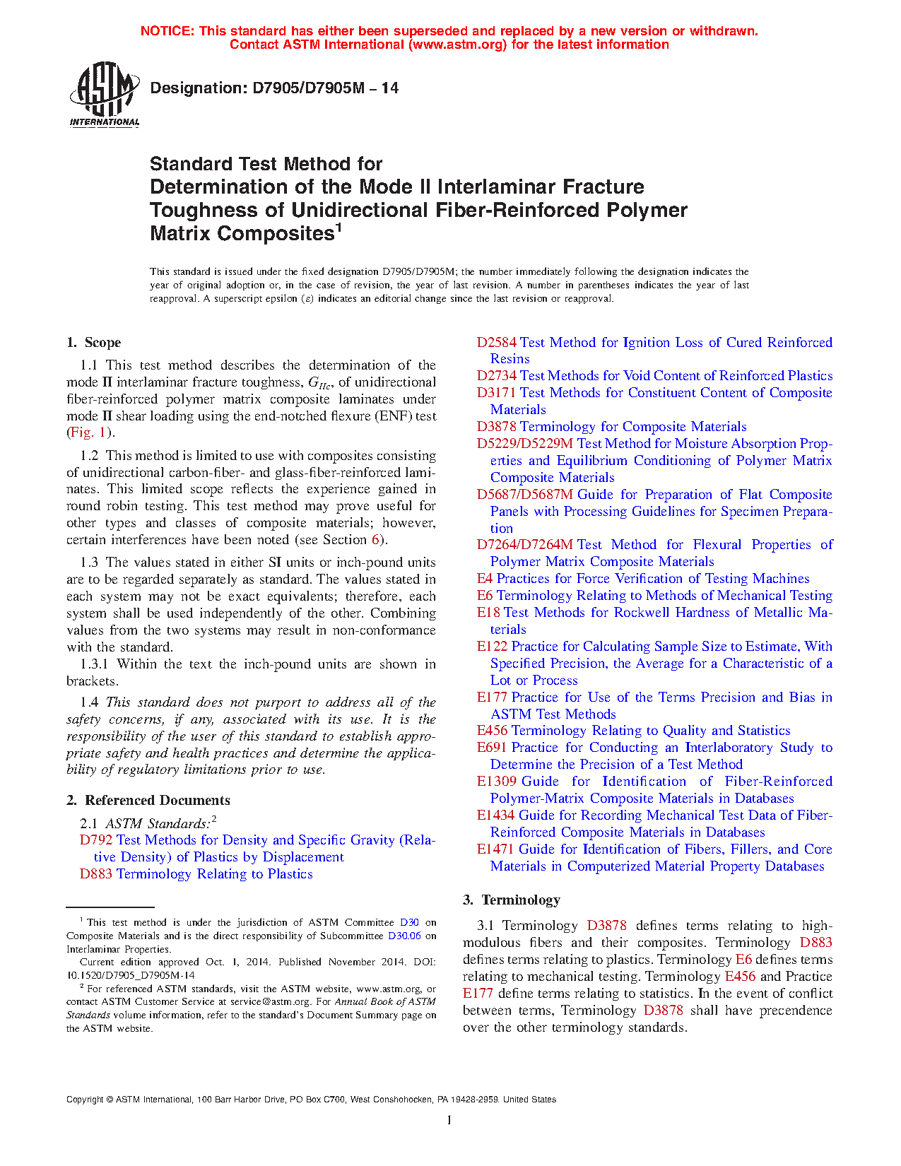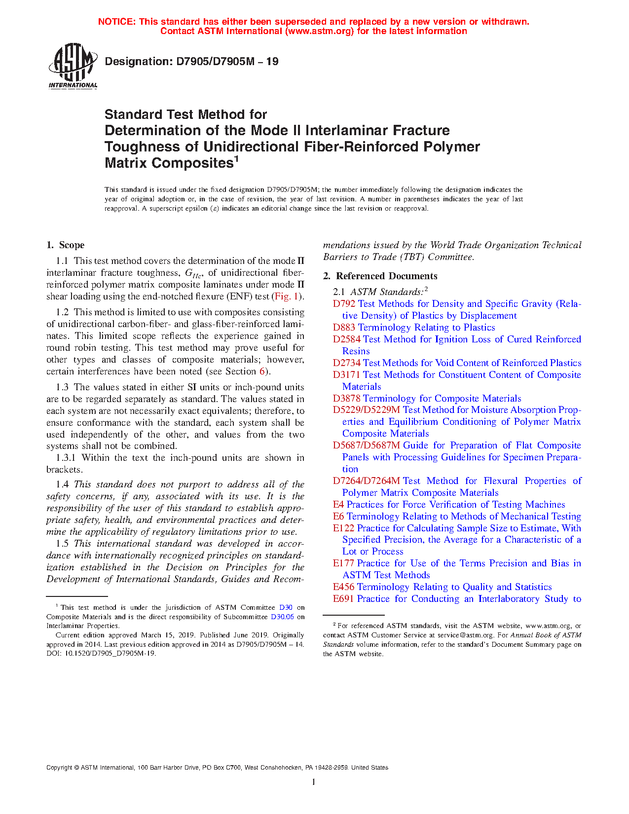 1.1 This test method covers the determination of the mode II interlaminar fracture toughness, GIIc, of unidirectional fiber-reinforced polymer matrix composite laminates under mode II shear loading using the end-notched flexure (ENF) test (Fig. 1).