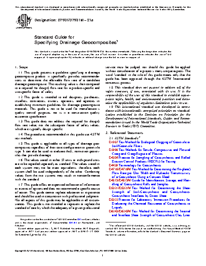 1.1 This guide presents a guideline specifying a drainage geocomposite product; it specifically provides recommendations to determine the allowable flow rate of a candidate drainage geocomposite. The resulting value is then compared to a required (or design) flow rate for a product-specific and site-specific factor of safety.