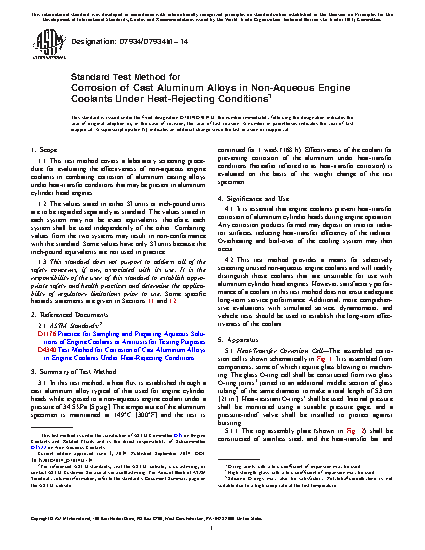 1.1 This test method covers a laboratory screening procedure for evaluating the effectiveness of non-aqueous engine coolants in combating corrosion of aluminum casting alloys under heat-transfer conditions that may be present in aluminum cylinder head engines.