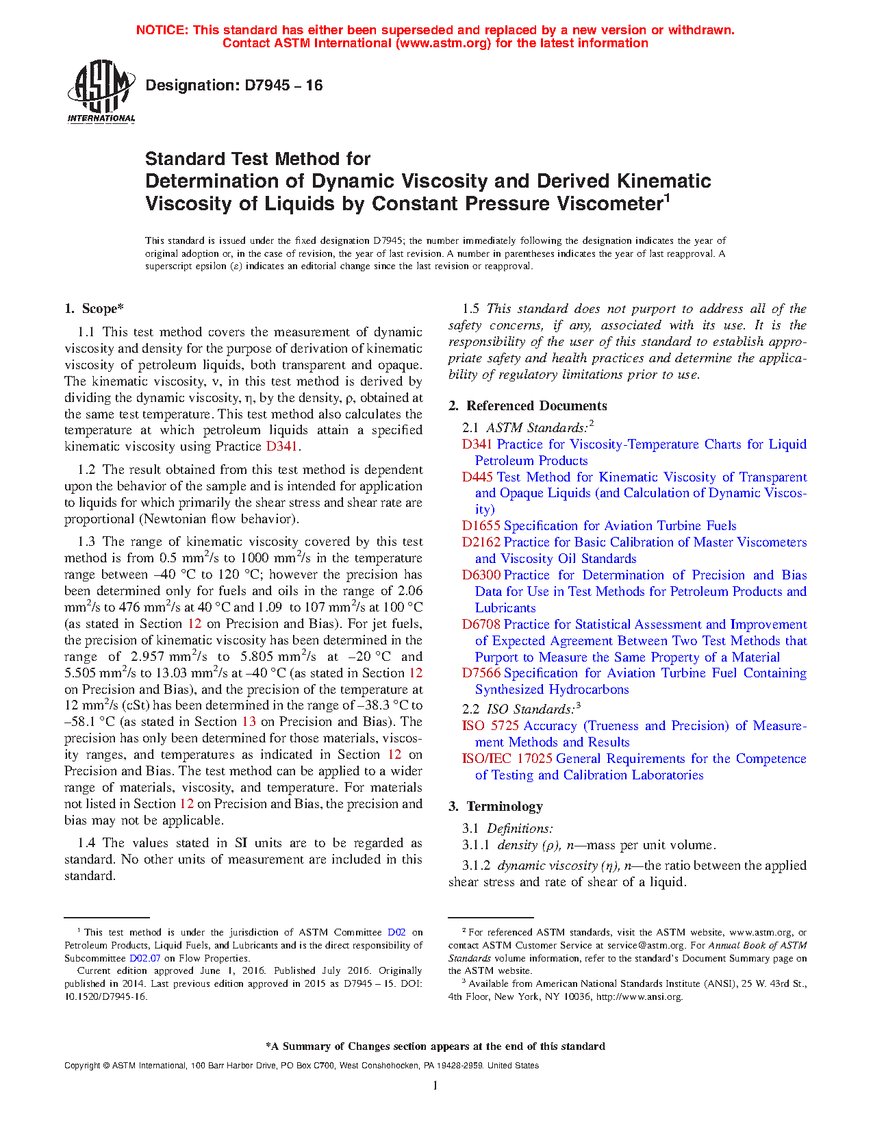 1.1 This test method covers the measurement of dynamic viscosity and density for the purpose of derivation of kinematic viscosity of petroleum liquids, both transparent and opaque. The kinematic viscosity, ν, in this test method is derived by dividing the dynamic viscosity, η, by the density, ρ, obtained at the same test temperature. This test method also calculates the temperature at which petroleum liquids attain a specified kinematic viscosity using Practice D341.