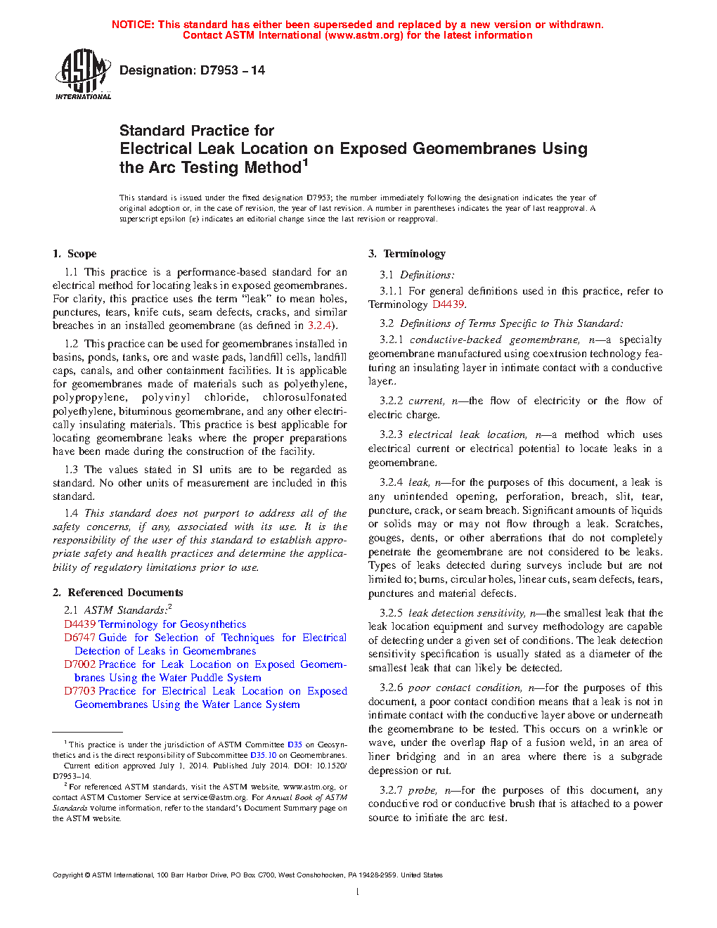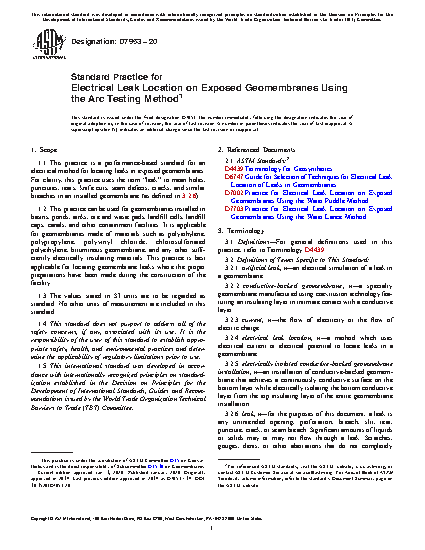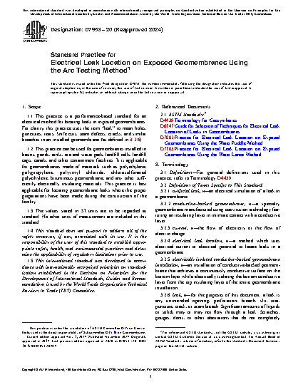 1.1 This practice is a performance-based standard for an electrical method for locating leaks in exposed geomembranes. For clarity, this practice uses the term “leak” to mean holes, punctures, tears, knife cuts, seam defects, cracks, and similar breaches in an installed geomembrane (as defined in 3.2.6).