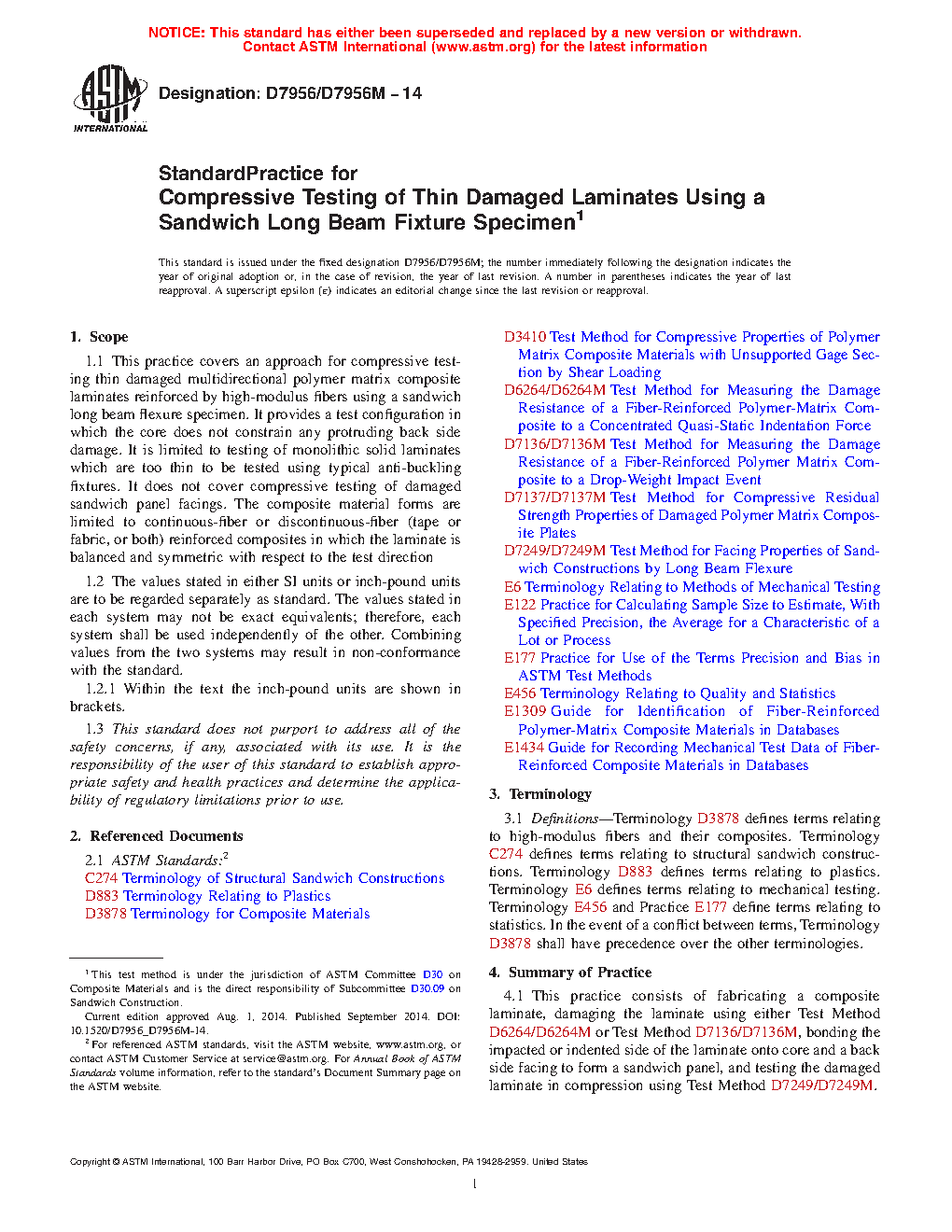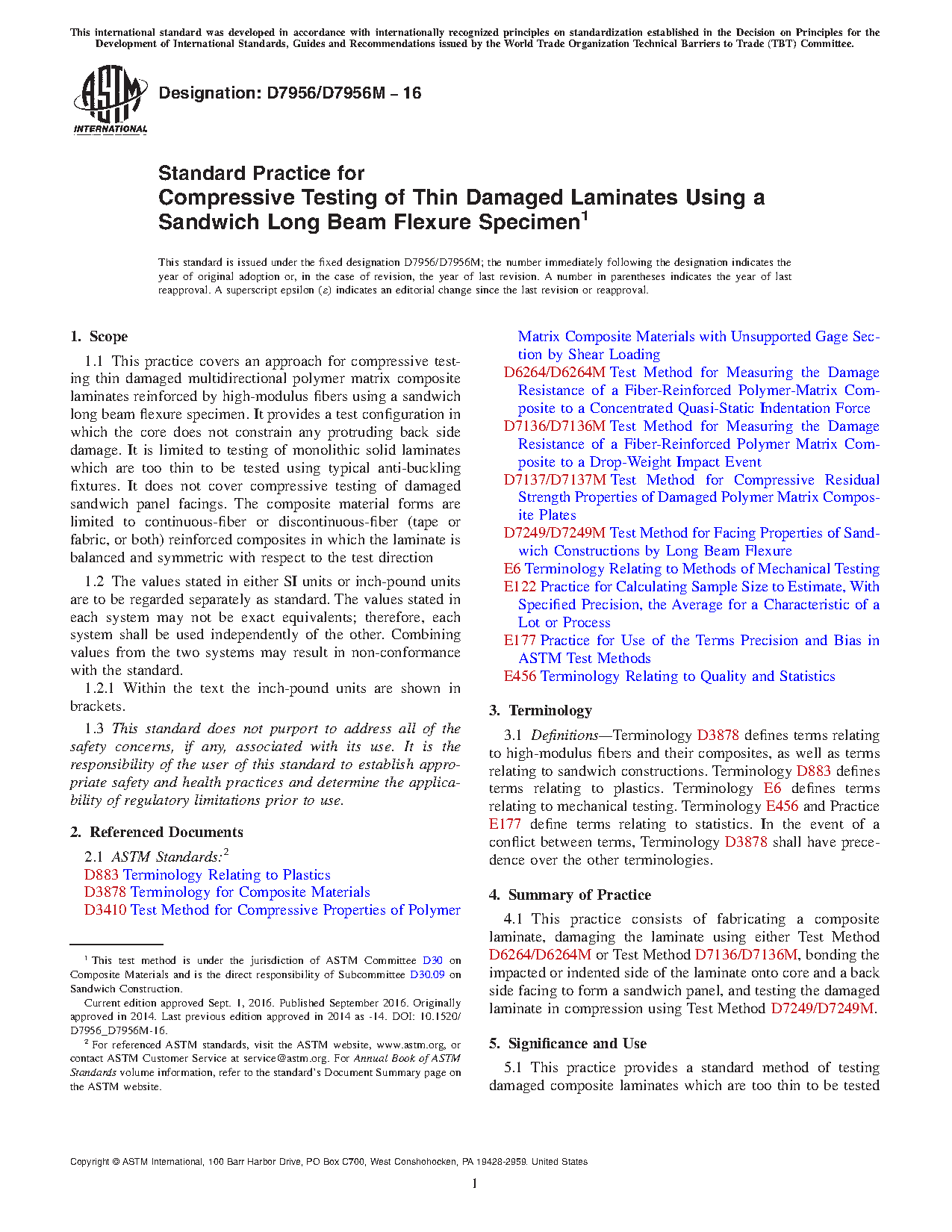 1.1 This practice covers an approach for compressive testing thin damaged multidirectional polymer matrix composite laminates reinforced by high-modulus fibers using a sandwich long beam flexure specimen. It provides a test configuration in which the core does not constrain any protruding back side damage. It is limited to testing of monolithic solid laminates which are too thin to be tested using typical anti-buckling fixtures. It does not cover compressive testing of damaged sandwich panel facings. The composite material forms are limited to continuous-fiber or discontinuous-fiber (tape or fabric, or both) reinforced composites in which the laminate is balanced and symmetric with respect to the test direction