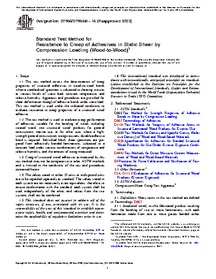 1.3 Creep of structural wood adhesives as measured by this test method may not be comparative to other ASTM methods and is limited to the conditions of the test and procedures contained herein.