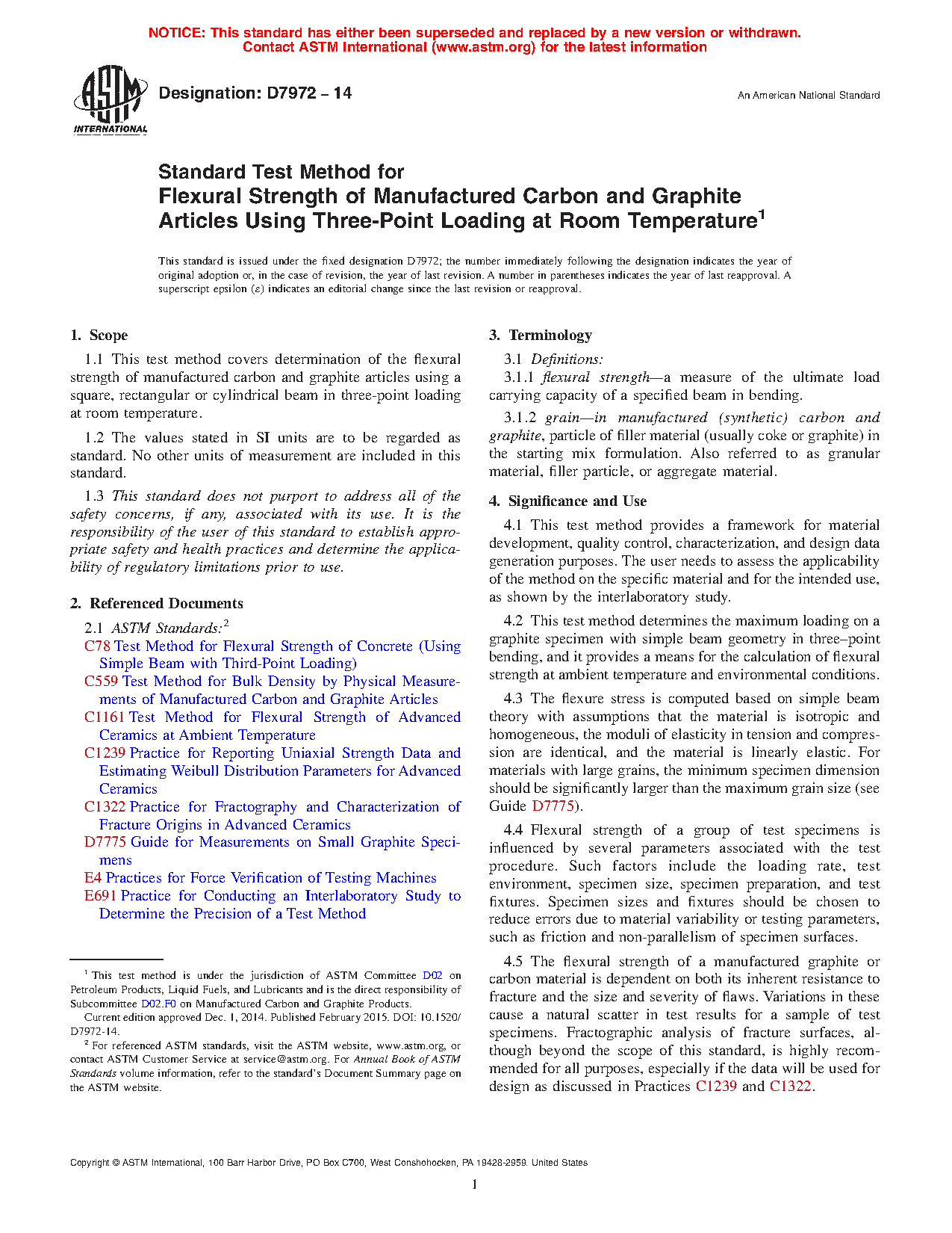 1.1 This test method covers determination of the flexural strength of manufactured carbon and graphite articles using a square, rectangular or cylindrical beam in three-point loading at room temperature.