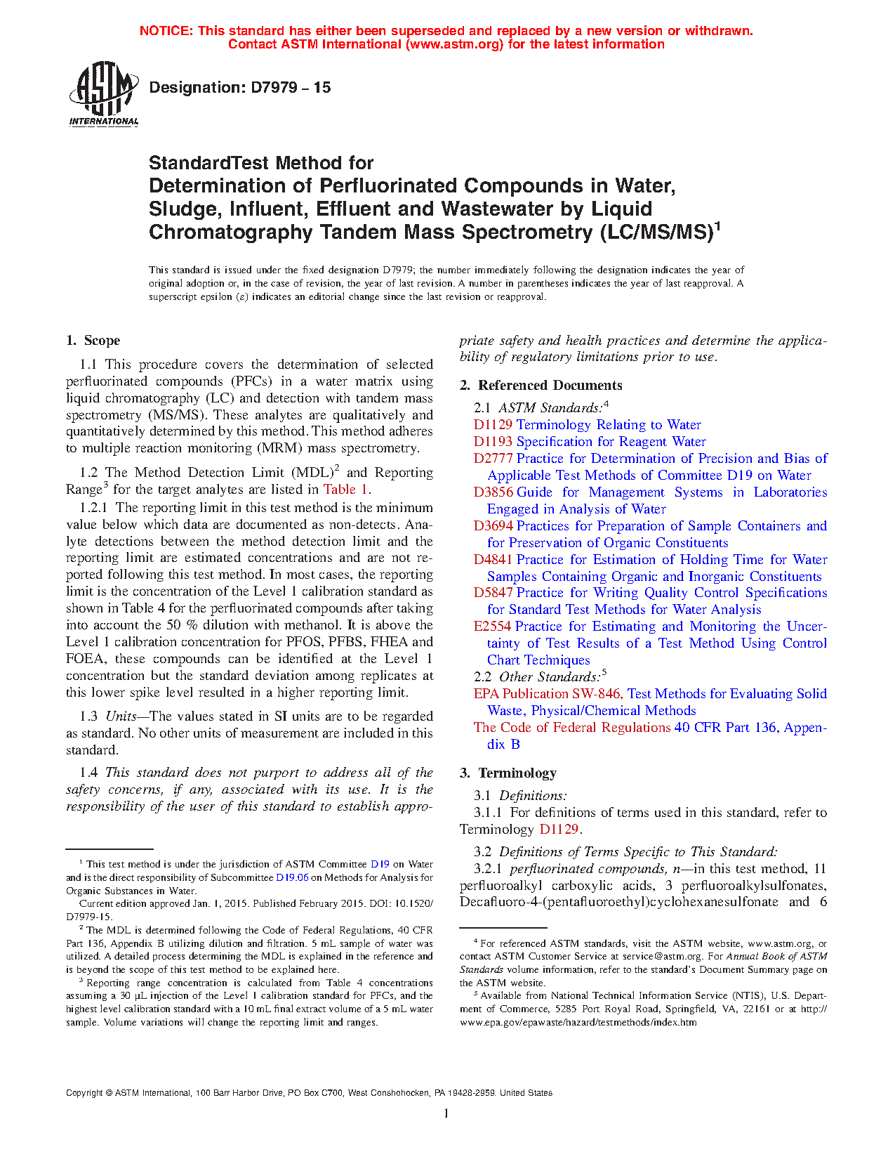 1.1 This procedure covers the determination of selected perfluorinated compounds (PFCs) in a water matrix using liquid chromatography (LC) and detection with tandem mass spectrometry (MS/MS). These analytes are qualitatively and quantitatively determined by this method. This method adheres to multiple reaction monitoring (MRM) mass spectrometry.