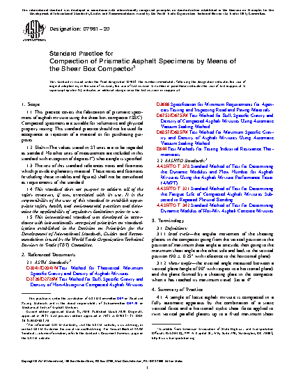 1.1 This practice covers the fabrication of prismatic specimens of asphalt mixture using the Shear Box Compactor (SBC). Compacted specimens are suitable for volumetric and physical property testing. This standard practice should not be used for acceptance or rejection of a material or for purchasing purposes.