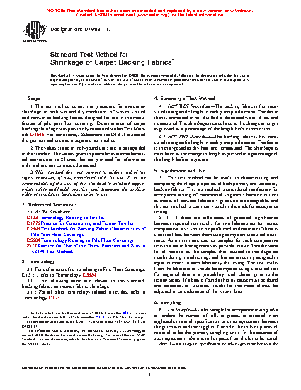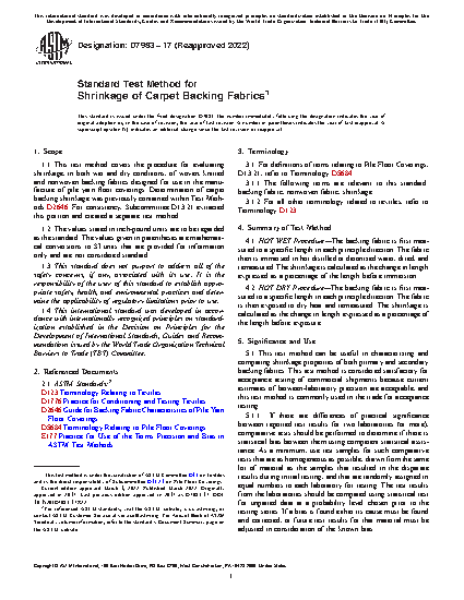 1.1 This test method covers the procedure for evaluating shrinkage, in both wet and dry conditions, of woven, knitted and nonwoven backing fabrics designed for use in the manufacture of pile yarn floor coverings. Determination of carpet backing shrinkage was previously contained within Test Methods D2646. For consistency, Subcommittee D13.21 extracted this portion and created a separate test method.