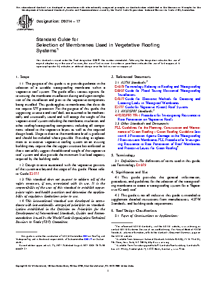 1.1 The purpose of this guide is to provide guidance in the selection of a suitable waterproofing membrane within a vegetative roof system. The guide offers various options for reviewing the membrane installation during and upon completion of the installation and prior to the vegetative components being installed. This guide applies to membranes that do or do not require UV protection. For the purpose of this guide, the supporting structure and roof deck are assumed to be mechanically and structurally sound and will accept the weight of the vegetative roof system including the membrane, insulation, and other roofing/waterproofing components including all components related to the vegetative layers as well as the required design loads. Slope to drain at the membrane level is preferred and should be included where possible. Providing a replacement or a re-cover vegetative roofing system on an existing building may require that the support structure be reinforced so that it can safely support the additional weight of the vegetative roof system and also provide the minimum live load capacity required by the building code.