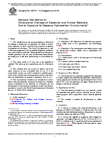 1.1 This standard gives the testing procedure to determine the change in dimensions of specimens of rubber or elastomeric materials, or both, resulting from exposure to gaseous hydrocarbon environments. The size of the specimens is such to facilitate preparation from as molded component configurations such as gaskets and seals. Where agreed to by both parties molded specimens may be used. Dimensional measurements are made prior to and after conditioning in a formulated test gas.