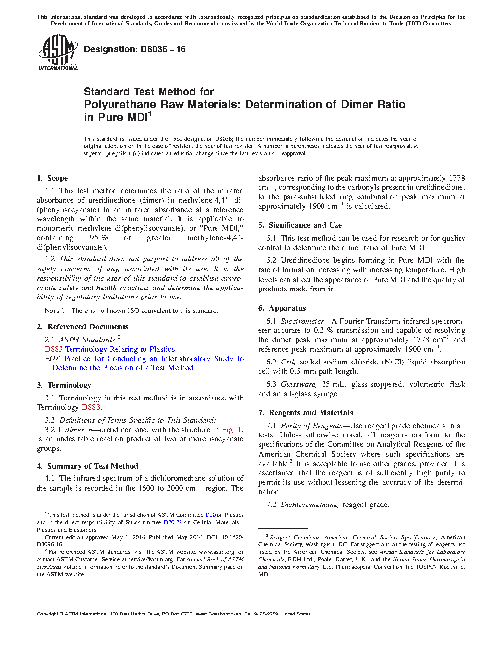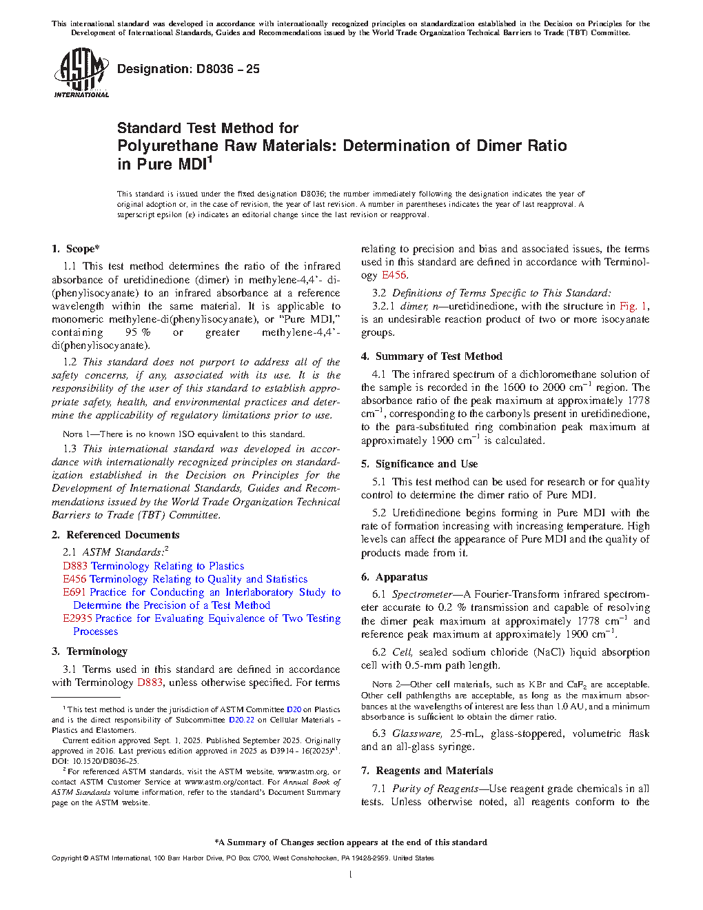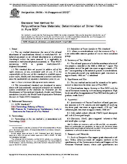 1.1 This test method determines the ratio of the infrared absorbance of uretidinedione (dimer) in methylene-4,4’- di(phenylisocyanate) to an infrared absorbance at a reference wavelength within the same material. It is applicable to monomeric methylene-di(phenylisocyanate), or “Pure MDI,” containing 95 % or greater methylene-4,4’-di(phenylisocyanate).