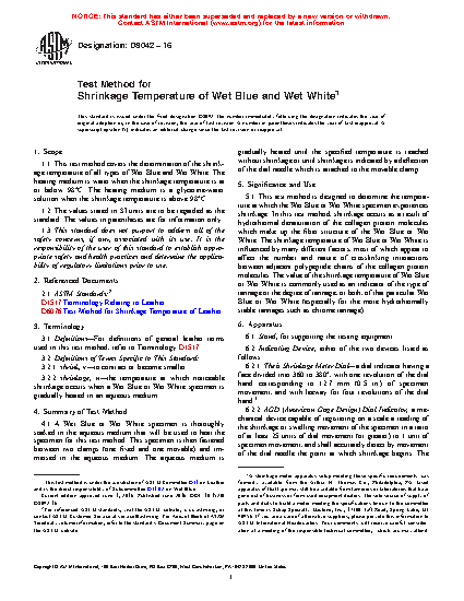 1.1 This test method covers the determination of the shrinkage temperature of all types of Wet Blue and Wet White. The heating medium is water when the shrinkage temperature is at or below 98 °C. The heating medium is a glycerine-water solution when the shrinkage temperature is above 98 °C.