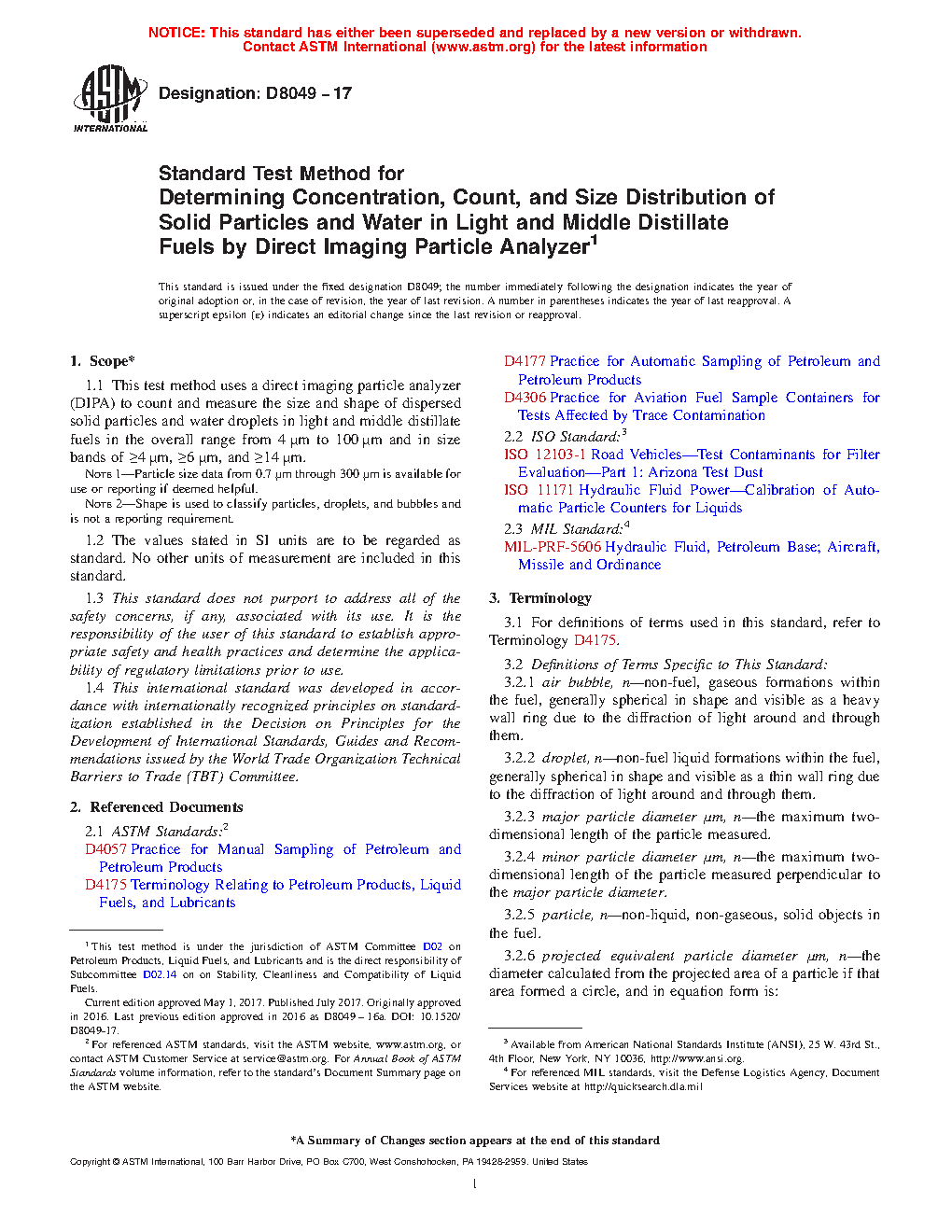 1.1 This test method uses a direct imaging particle analyzer (DIPA) to count and measure the size and shape of dispersed solid particles and water droplets in light and middle distillate fuels in the overall range from 4 μm to 100 μm and in size bands of ≥4 μm, ≥6 μm, and ≥14 μm.