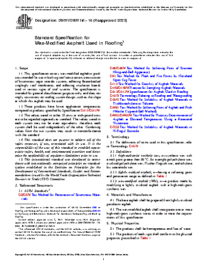 This specification establishes the manufacturing process and physical requirements for wax-modified asphaltic products intended for built-up roof construction, construction of bituminous vapor retarder systems, adhering fleece-backed single-ply roof membranes, and adhering insulation boards used in various types of roof systems. The base asphalt shall be prepared from lightly oxidized petroleum asphalt, and the wax-modified asphalt shall incorporate one or more high melt-point synthetic waxes. Furthermore, the products shall be homogeneous and free of water.