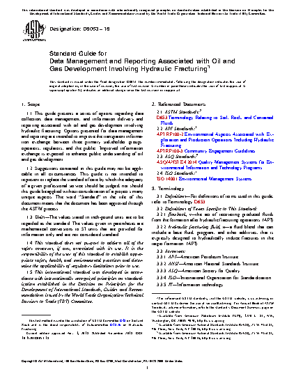 1.1 This guide presents a series of options regarding data collection, data management, and information delivery and reporting associated with oil and gas development involving hydraulic fracturing. Options presented for data management and reporting are intended to improve the transparent information exchange between three primary stakeholder groups: operators, regulators, and the public. Improved information exchange is expected to enhance public understanding of oil and gas development.