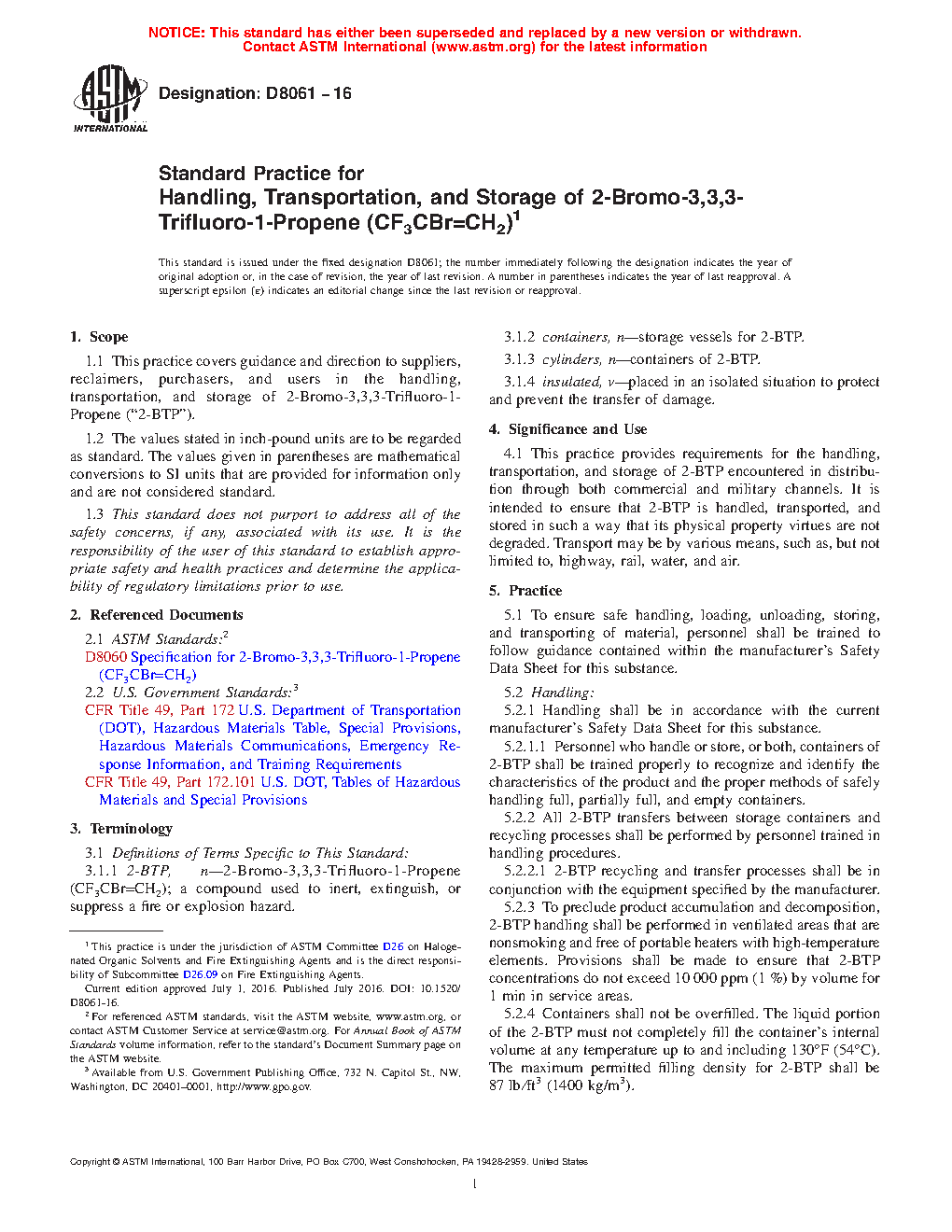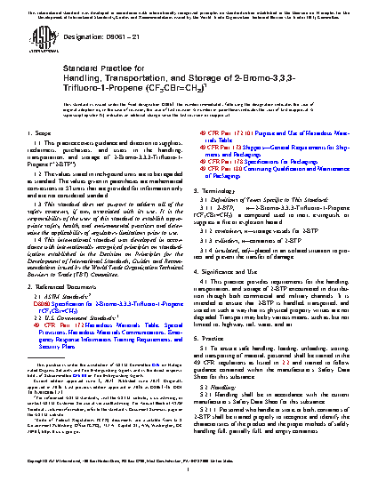 1.1 This practice covers guidance and direction to suppliers, reclaimers, purchasers, and users in the handling, transportation, and storage of 2-Bromo-3,3,3-Trifluoro-1-Propene (“2-BTP”).