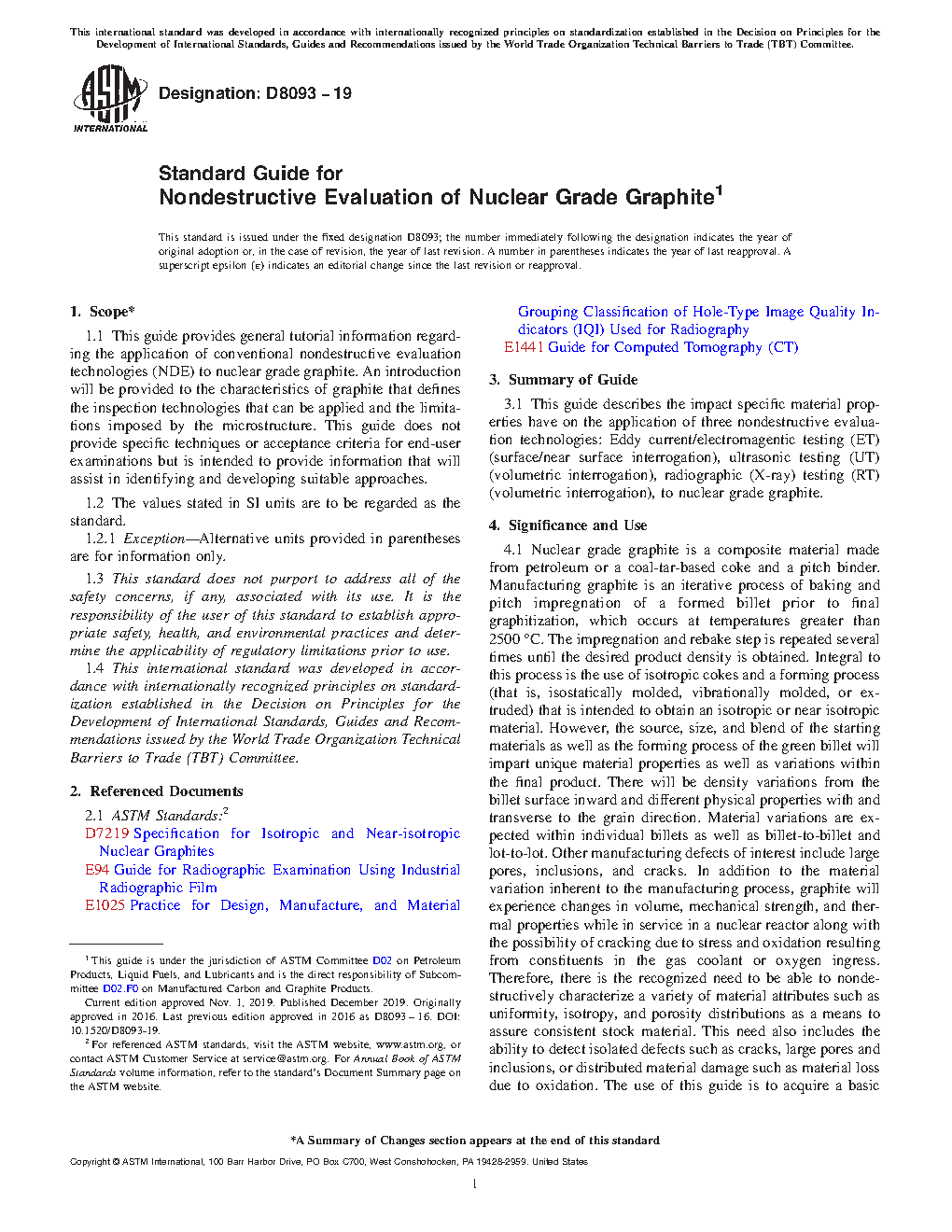 4.1 Nuclear grade graphite is a composite material made from petroleum or a coal-tar-based coke and a pitch binder. Manufacturing graphite is an iterative process of baking and pitch impregnation of a formed billet prior to final graphitization, which occurs at temperatures greater than 2500 °C. The impregnation and rebake step is repeated several times until the desired product density is obtained. Integral to this process is the use of isotropic cokes and a forming process (that is, isostatically molded, vibrationally molded, or extruded) that is intended to obtain an isotropic or near isotropic material. However, the source, size, and blend of the starting materials as well as the forming process of the green billet will impart unique material properties as well as variations within the final product. There will be density variations from the billet surface inward and different physical properties with and transverse to the grain direction. Material variations are expected within individual billets as well as billet-to-billet and lot-to-lot. Other manufacturing defects of interest include large pores, inclusions, and cracks. In addition to the material variation inherent to the manufacturing process, graphite will experience changes in volume, mechanical strength, and thermal properties while in service in a nuclear reactor along with the possibility of cracking due to stress and oxidation resulting from constituents in the gas coolant or oxygen ingress. Therefore, there is the recognized need to be able to nondestructively characterize a variety of material attributes such as uniformity, isotropy, and porosity distributions as a means to assure consistent stock material. This need also includes the ability to detect isolated defects such as cracks, large pores and inclusions, or distributed material damage such as material loss due to oxidation. The use of this guide is to acquire a basic understanding of the unique attributes of nuclear grade graphite and its application that either permits or hinders the use of conventional eddy current, ultrasonic, or X-ray inspection technologies.