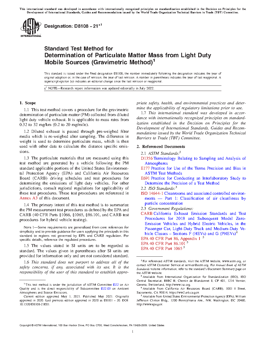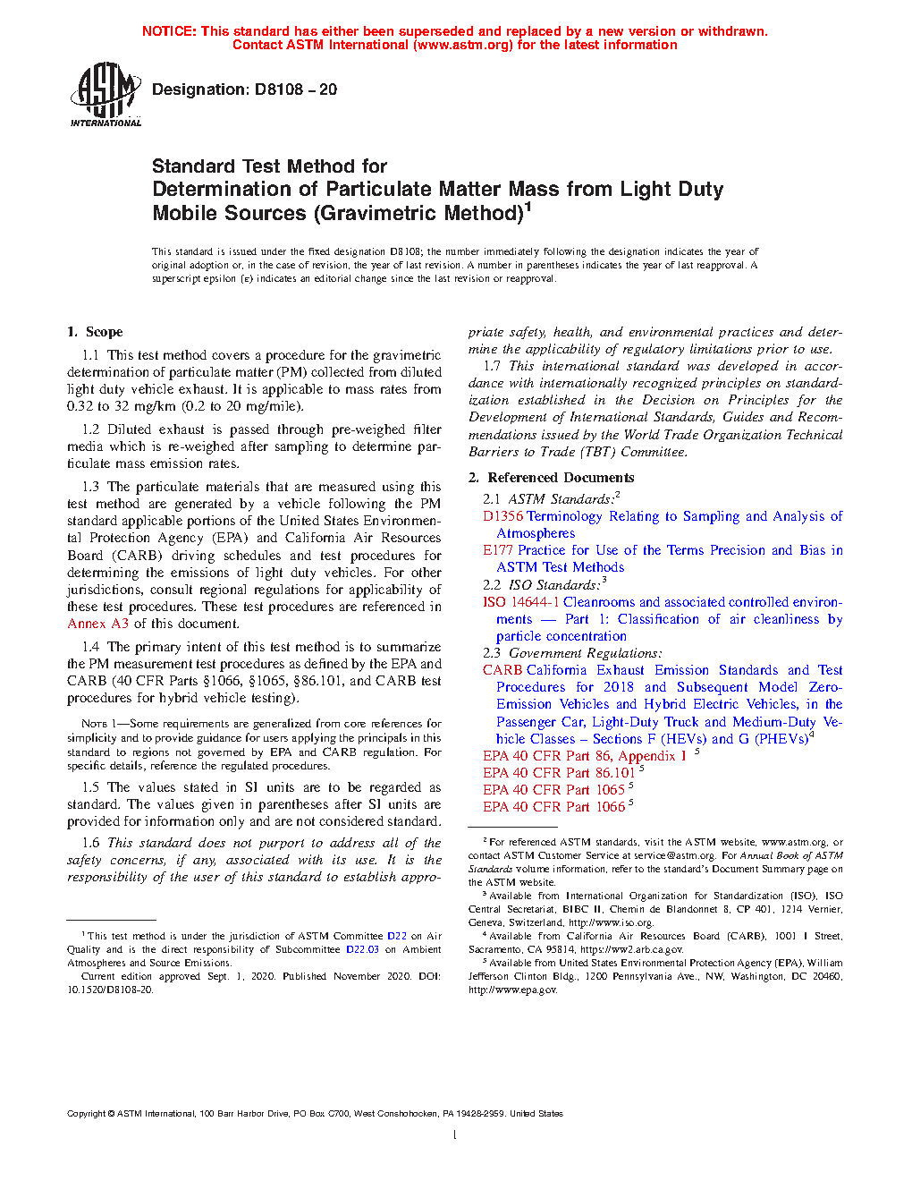 1.4 The primary intent of this test method is to summarize the PM measurement test procedures as defined by the EPA and CARB (40 CFR Parts §1066, §1065, §86.101, and CARB test procedures for hybrid vehicle testing).