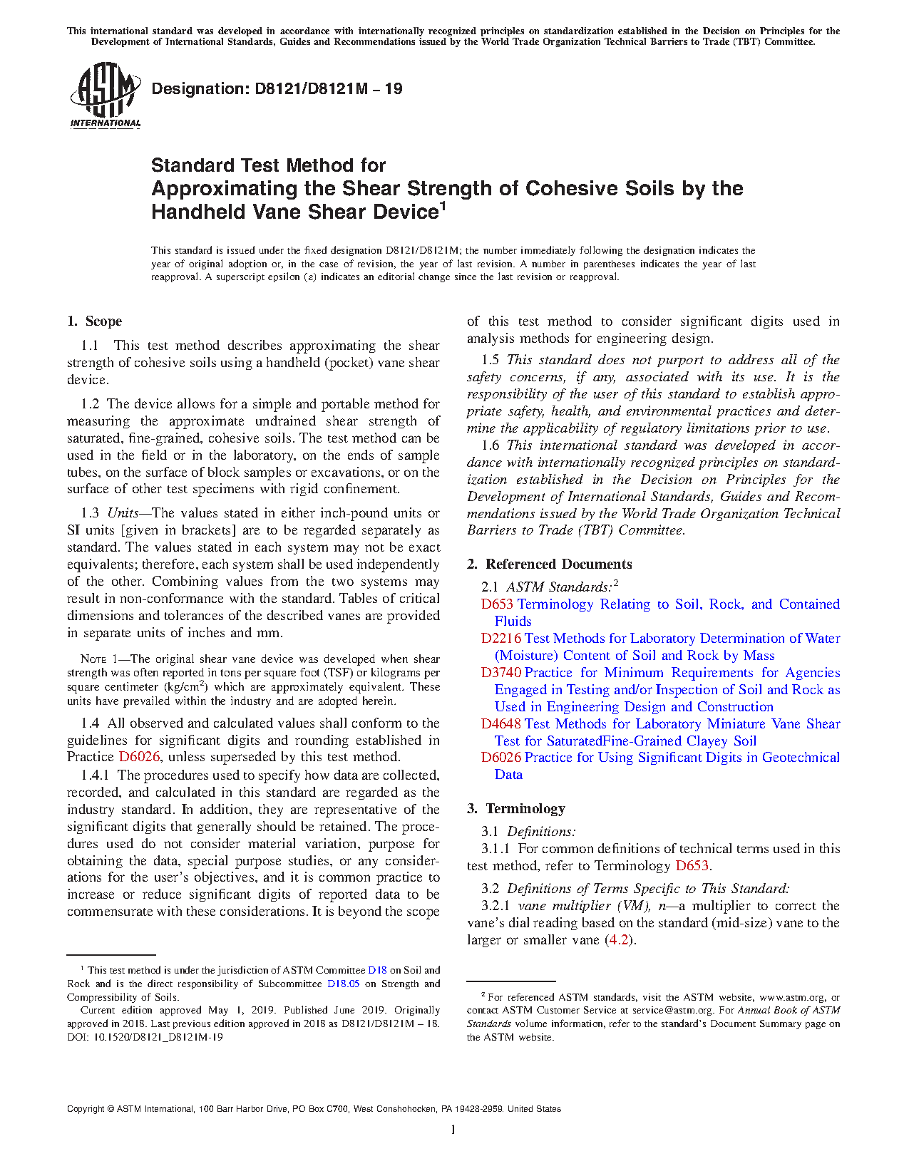 5.1 The handheld shear vane method provides a rapid method of measuring the approximate undrained shear strength of a fine-grained, cohesive soil either in the field or laboratory. This standard does not supplement or replace D4648.
