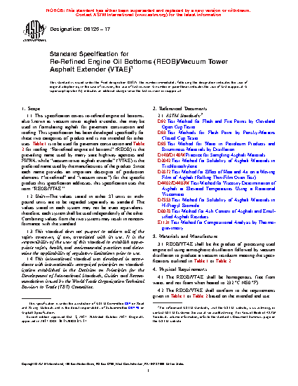 1.1 This specification covers re-refined engine oil bottoms, also known as vacuum tower asphalt extender, that may be used in formulating asphalt for pavement construction and roofing. This specification has been developed specifically for these two categories of product and is not intended for other uses. Table 1 is to be used for pavement construction and Table 2 for roofing. “Re-refined engine oil bottoms” (REOB) is the prevailing name used by many state highway agencies and FHWA, while “vacuum tower asphalt extender” (VTAE) is the preferred name used by the manufacturers of the product. Since each name provides an important descriptor of production elements (“re-refined” and “vacuum tower”) for the specific product this specification addresses, this specification uses the term “REOB/VTAE.”
