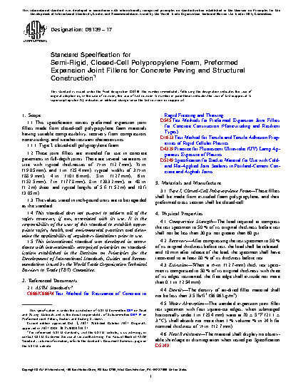 1.1 This specification covers preformed expansion joint fillers made from closed-cell polypropylene foam materials having suitable compressibility, recovery from compression, nonextruding, and weather-resistant characteristics.