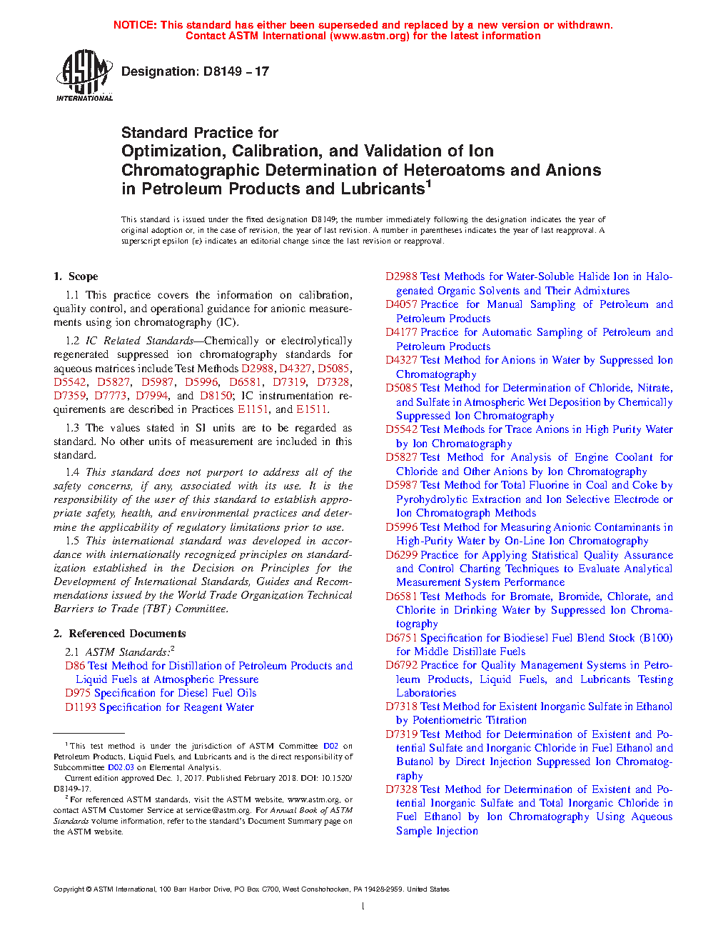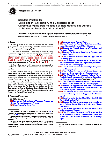 7.2 Ion chromatography is often used in cases where anion content of the material is desired. Some of the hetero-atoms can be converted by combustion in an oxygen atmosphere followed by aqueous dissolution to convert them into anions before ion chromatographic determination. A number of ion chromatographic ASTM standards issued are listed in Section 2. Of these, the D02, D05, and D16 Committee standards which use ion chromatography are listed in Table 1.