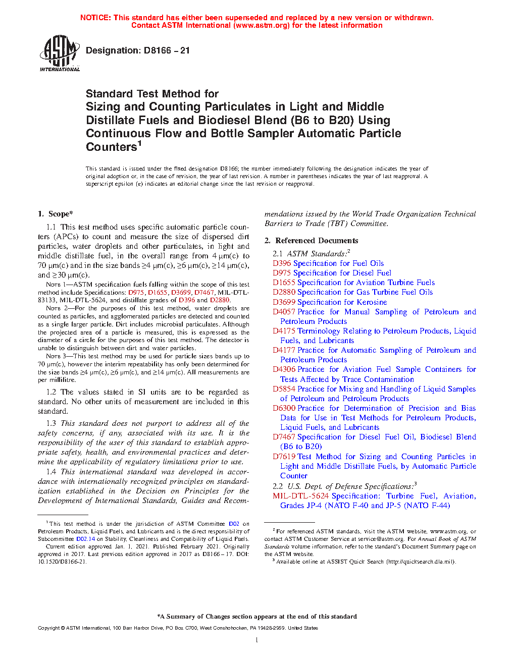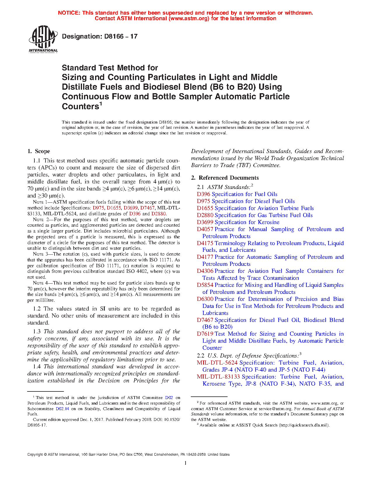 Note 2: ASTM specification fuels falling within the scope of this test method include Specifications: D975, D1655, D3699, D7467, MIL-DTL-83133, MIL-DTL-5624, and distillate grades of D396 and D2880.