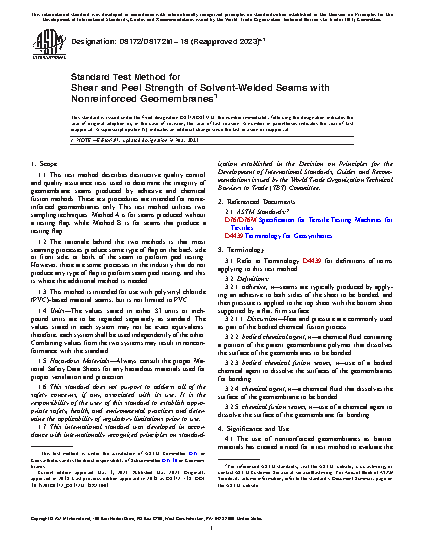 4.1 The use of nonreinforced geomembranes as barrier materials has created a need for a test method to evaluate the quality of chemical fusion seams produced by methods other than thermal fusion. This test method is used for quality control purposes and is intended to provide quality control and quality assurance personnel with a method to evaluate seam quality.