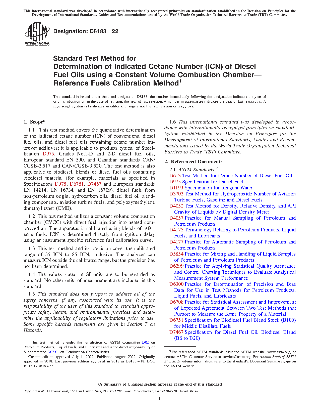 1.1 This test method covers the quantitative determination of the indicated cetane number (ICN) of conventional diesel fuel oils, and diesel fuel oils containing cetane number improver additives; it is applicable to products typical of Specification D975, Grades No.1-D and 2-D diesel fuel oils, European standard EN 590, and Canadian standards CAN/CGSB-3.517 and CAN/CGSB-3.520. The test method is also applicable to biodiesel, blends of diesel fuel oils containing biodiesel material (for example, materials as specified in Specifications D975, D6751, D7467 and European standards EN 14214, EN 16734, and EN 16709), diesel fuels from non-petroleum origin, hydrocarbon oils, diesel fuel oil blending components, aviation turbine fuels, and polyoxymethylene dimethyl ether (OME).