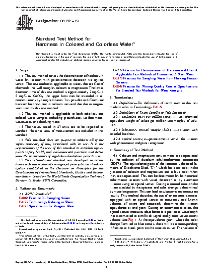 1.1 This test method covers the determination of hardness in water by titration with potentiometric detection via optical sensor. This test method is applicable to waters that are free of chemicals that will complex calcium or magnesium. The lower detection limit of this test method is approximately 2 mg/L to 5 mg/L as CaCO3; the upper limit can be extended to all concentrations by sample dilution. It is possible to differentiate between hardness due to calcium ions and that due to magnesium ions by this test method.