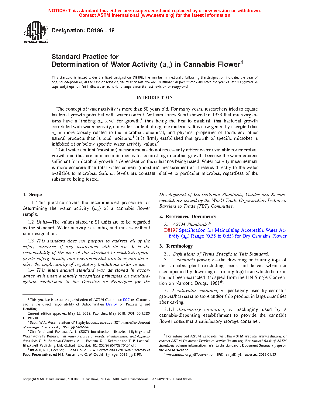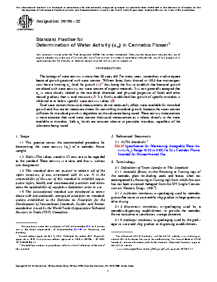1.1 This practice covers the recommended procedure for determining the water activity (aw) of a cannabis flower sample.