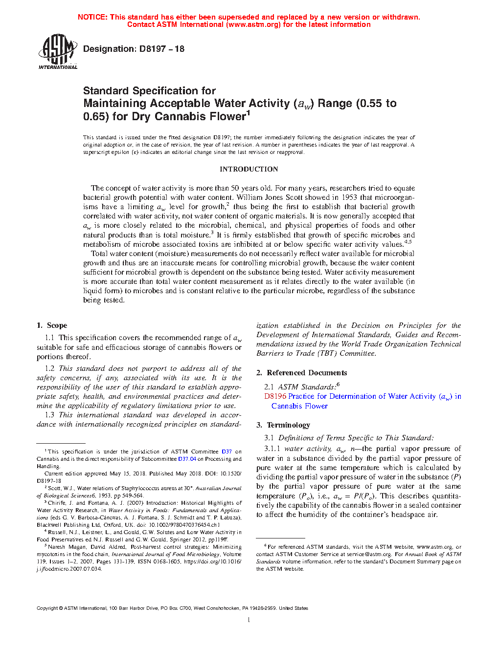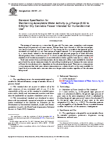 1.1 This specification covers the recommended range of aw suitable for safe and efficacious storage of cannabis flowers or portions thereof.