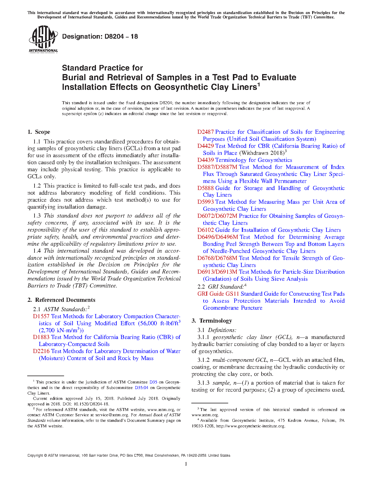 5.2 A uniform practice for installing and retrieving representative sample(s) from a test pad is needed to assess installation damage using project-specific or generally accepted, representative materials and procedures. Damage of a specific grade and type of GCL under specific installation procedures may be assessed with sample(s) exhumed from a full-scale test pad.