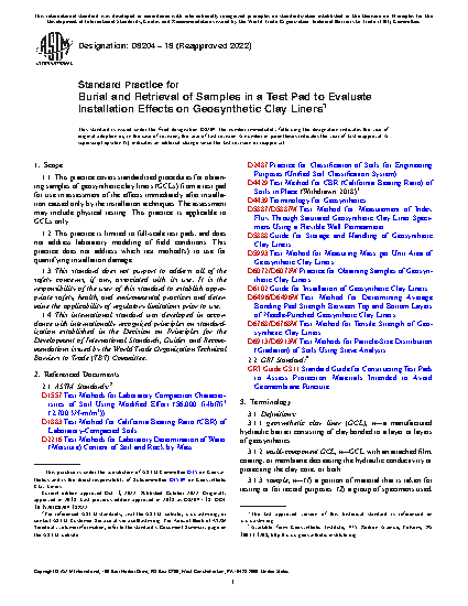 1.1 This practice covers standardized procedures for obtaining samples of geosynthetic clay liners (GCLs) from a test pad for use in assessment of the effects immediately after installation caused only by the installation techniques. The assessment may include physical testing. This practice is applicable to GCLs only.