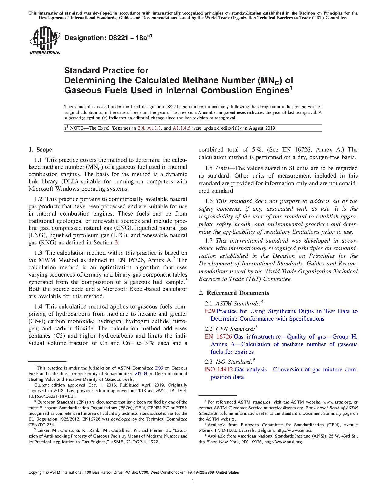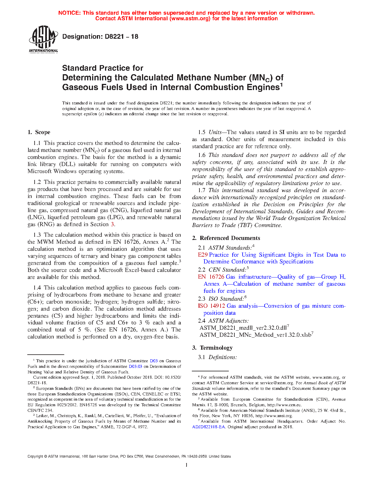 1.1 This practice covers the method to determine the calculated methane number (MNC) of a gaseous fuel used in internal combustion engines. The basis for the method is a dynamic link library (DLL) suitable for running on computers with Microsoft Windows operating systems.