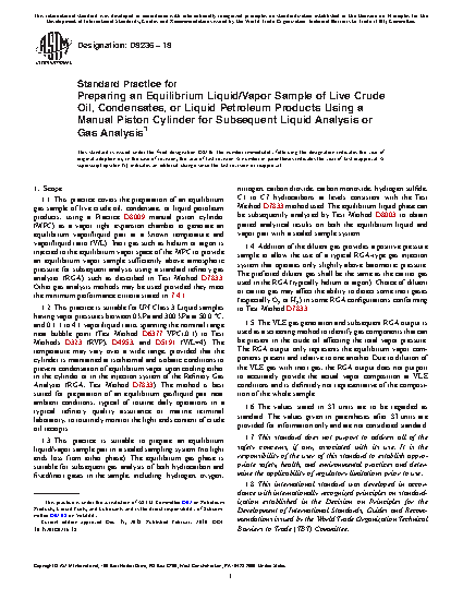 1.1 This practice covers the preparation of an equilibrium gas sample of live crude oil, condensate, or liquid petroleum products, using a Practice D8009 manual piston cylinder (MPC) as a vapor tight expansion chamber to generate an equilibrium vapor/liquid pair at a known temperature and vapor/liquid ratio (V/L). Inert gas such as helium or argon is injected to the equilibrium vapor space of the MPC to provide an equilibrium vapor sample sufficiently above atmospheric pressure for subsequent analysis using a standard refinery gas analyzer (RGA) such as described in Test Method D7833. Other gas analysis methods may be used provided they meet the minimum performance criteria stated in 7.4.1.