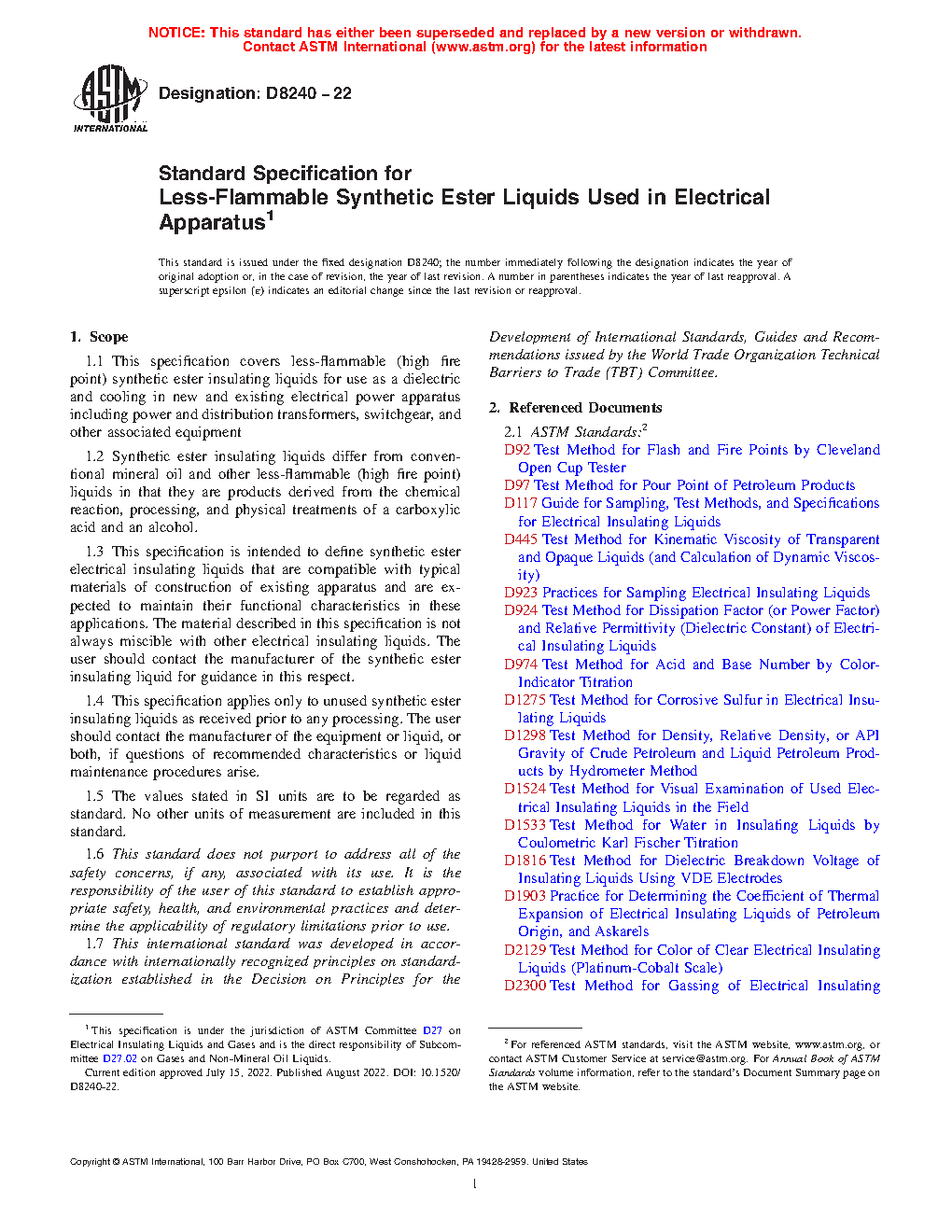 1.1 This specification covers less-flammable (high fire point) synthetic ester insulating liquids for use as a dielectric and cooling in new and existing electrical power apparatus including power and distribution transformers, switchgear, and other associated equipment